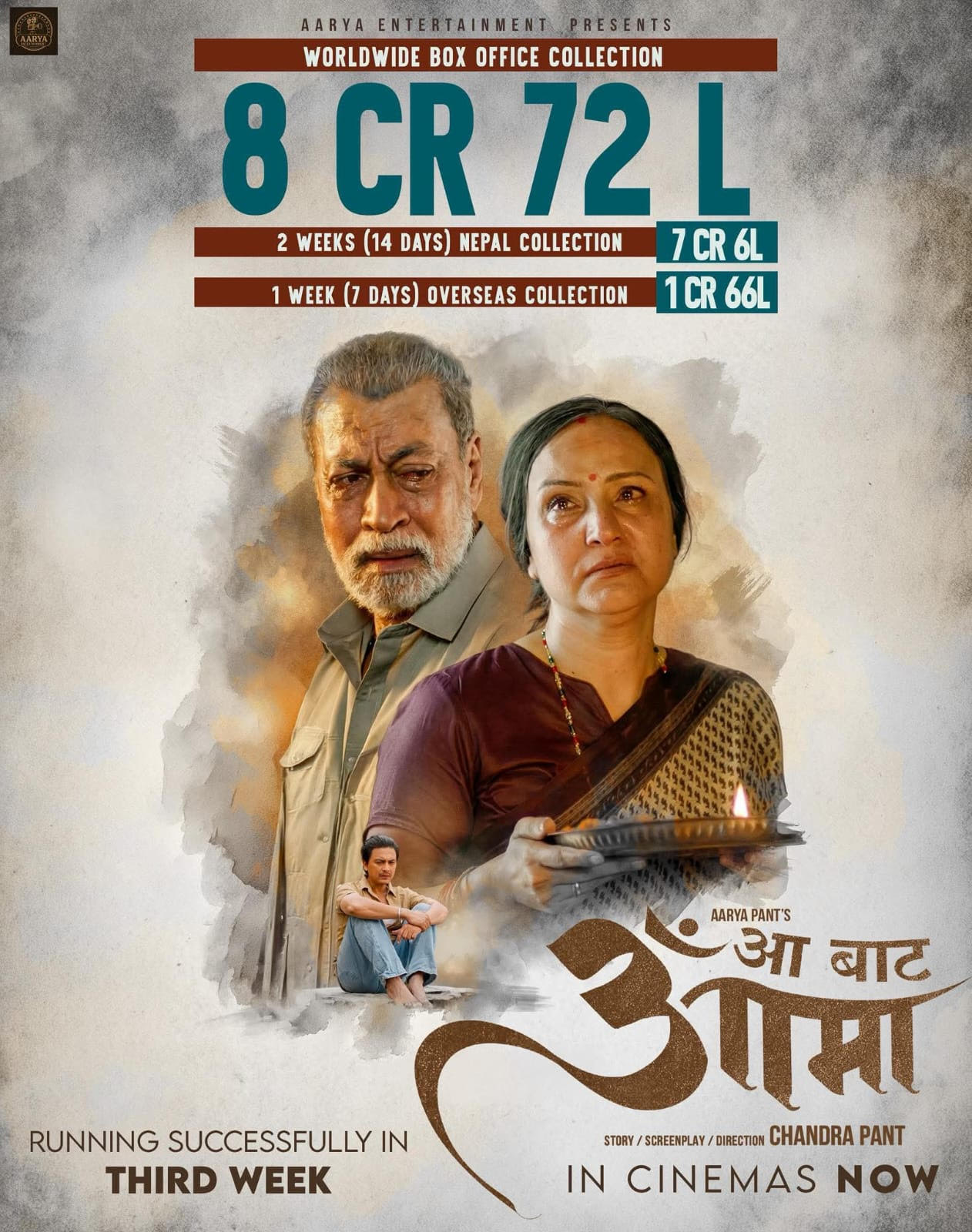 १ फागुन, काठमाडौं । चन्द्र पन्त निर्देशित फिल्म ‘आ बाट आमा’ले ९ करोड नजिक कमाई गरिसकेको छ। गत माघ १६ गतेबाट प्रदर्शनमा आएको यो फिल्मले अहिलेसम्म ८ करोड ७२ लाख ग्रस