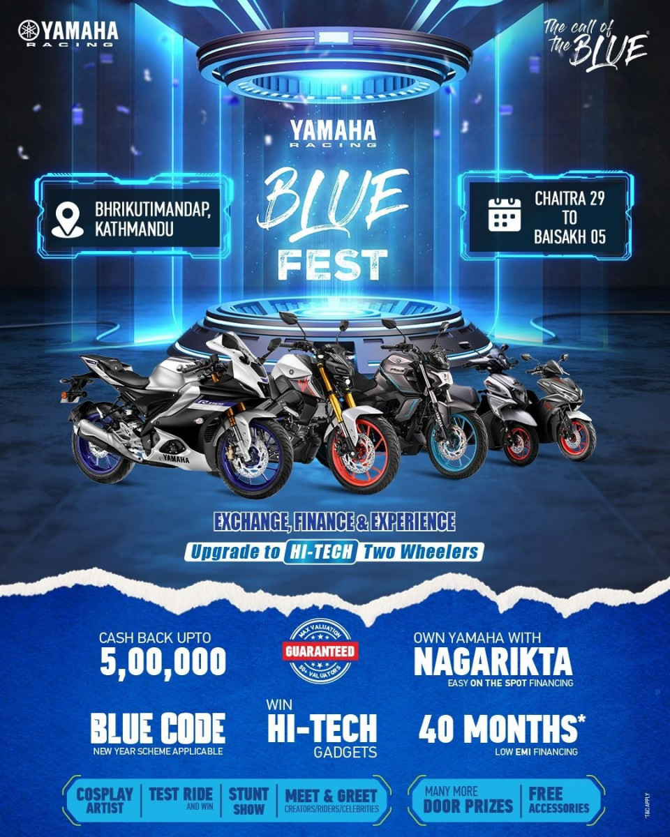 २७ चैत, काठमाडाैं। यामाहा नेपालले आफ्नो अधिकृत वितरक एम.ए.डब्लू. राइड्स प्रा. लि. मार्फत बहुप्रतिक्षित वार्षिक कार्यक्रम “यामाहा ब्लु फेस्ट” पुनः आयोजना गर्ने भएको छ। यो