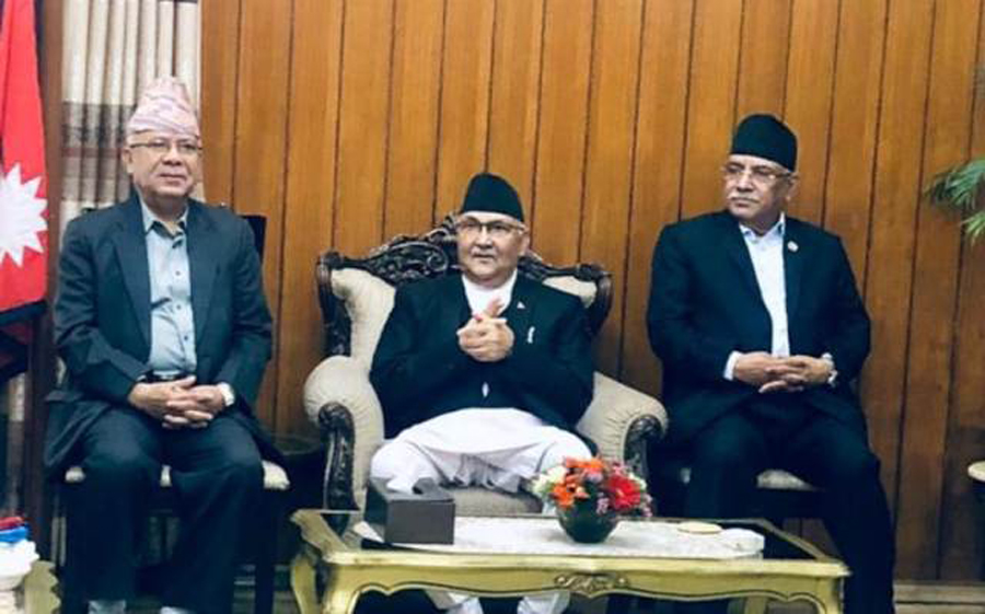 प्रधानमन्त्री ओली, अध्यक्ष प्रचण्ड र नेता नेपालबीच बालुवाटारमा भेटवार्ता