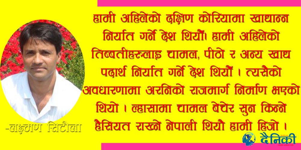 हामीसगै उदय भएका देशहरुमा हामी चाहिँ उनीहरूको नोकर भएर काम गर्न जानुपर्ने बाध्यता आज कसरी आयो यो गम्भीर बिषय हो । हामी अहिलेको दक्षिण कोरियामा खाद्यान्न निर्यात गर्ने देश थियौँ। हामी अहिलेको तिब्बतीहरुलाइ चामल, पीठाे र अन्य खाद्य पदार्थ निर्यात गर्ने देश थियौँ । त्यसैको अवधारणामा अरनिको राजमार्ग निर्माण भएको थियोे । ल्हासामा चामल बेचेर सुन किन्ने हैसियत राख्ने नेपाली थियौ हामी हिजो । पहिले ल्हासाबाट सुन आयात गर्ने नेपाली अहिले लुगाफाटो आयात गर्छ। हामी सुनबाट लत्ताकपडा र दैनिक उपभोगका सामान आयात गर्छौ अहिले । पहिला ल्हासालाई चामल र पिठो बेचेर सुन किन्ने नेपाली अहिले आफै दुनाबोता टपरी देखि चामल झिकाएर खानुपर्ने अवस्था छ। अहिले ल्हासा सर्वसम्पन्न छ। अहिले दक्षिण कोरिया प्रगतिको त्यो उचाइमा पुग्यो जाहा हामीलाई उनीहरूले नोकर बनाइरहेका छन।