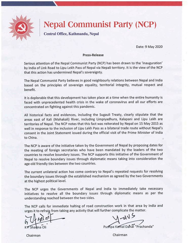 लिपुलेकको सडक निर्माण तत्काल रोक्न भारतलाई ओली र प्रचण्डको आग्रह (विज्ञप्तिसहित)