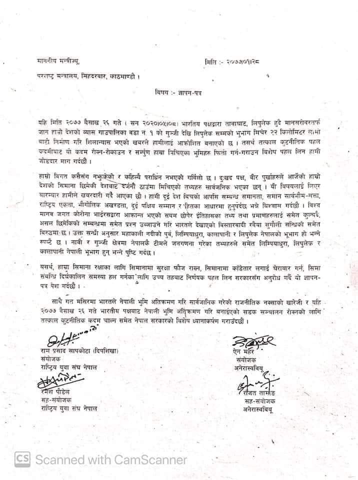 परराष्ट्रमन्त्री प्रदीपकुमार ज्ञवालीलाई आइतबार ज्ञापनपत्र बुझाउँदै राष्ट्रिय युवा संघ नेपाल र अनेरास्ववियूले सिमाना रक्षा गर्न सुरक्षा फौज राख्न र काडेतार लगाई घेराबार गर्न आग्रह गरेको हो ।