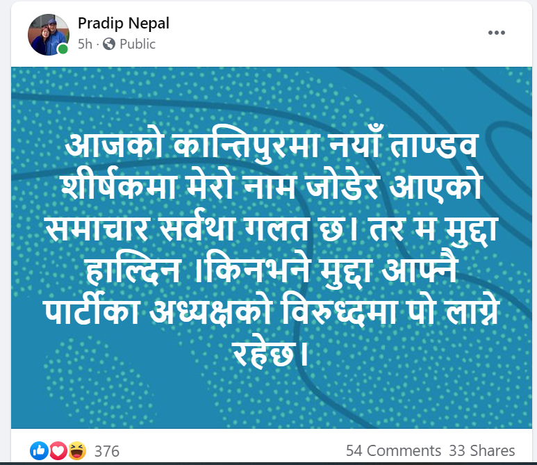 उनले भनेका छन ‘आजको कान्तिपुरमा नयाँ ताण्डव शीर्षकमा मेरो नाम जोडेर आएको समाचार सर्वथा गलत छ। तर म मुद्दा हाल्दिन । किनभने मुद्दा आफ्नै पार्टीका अध्यक्षको विरुध्दमा पो लाग्ने रहेछ।’ नेता नेपालले भ्रम छरेको अभियोगमा मुद्दा हाल्यो भने आफ्नै अध्यक्षमा लाग्ने भएकाले हाल्दिन भनेका छन ।