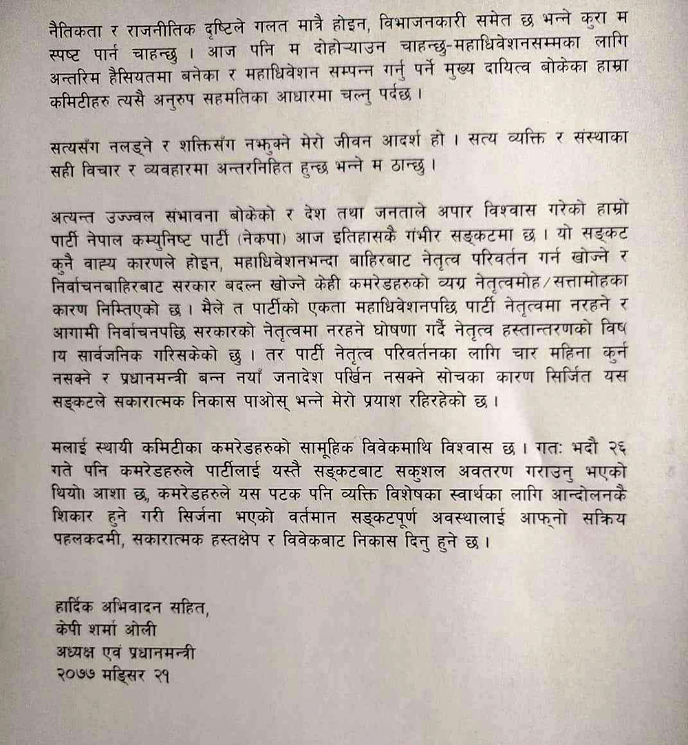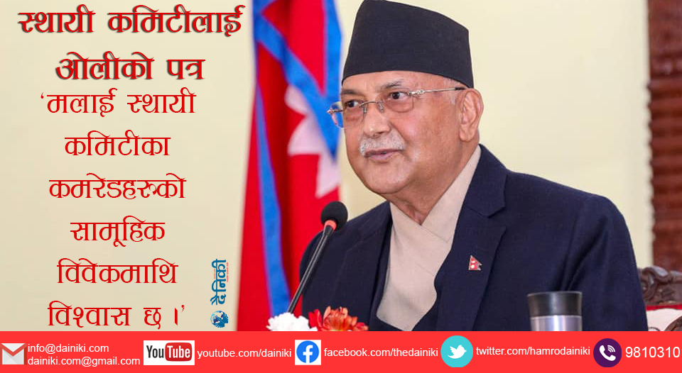 स्थायी कमिटीका कमरेडहरूको सामूहिक विवेकमाथि विश्वास छः प्रधानमन्त्री ओली (पत्रसहित)