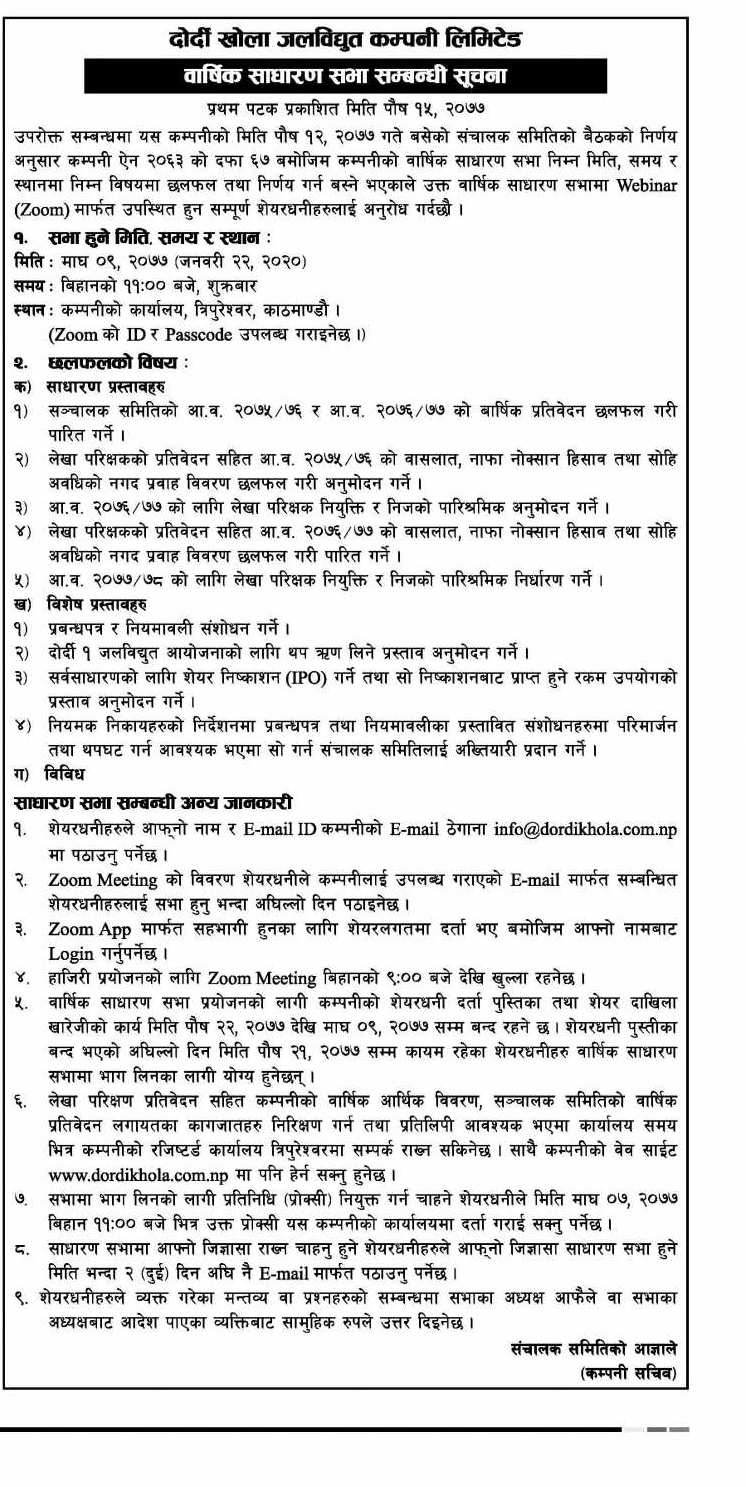 १५ पुस, काठमाडाैँ । दोर्दी खोला जलविद्युत कम्पनी लिमिटेडले वार्षिक साधारणसभा आह्वान गरेको छ । पौष १२ गते बसेको संस्थाको संचालक समितिको बैठककाे निर्णयानुसार माघ ९ गते, शुक्रबार कम्पनीको कार्यालय, त्रिपुरेश्वर काठमाडौँमा बिहान ११ बजे जुमको माध्यमबाट सुरु हुनेछ । सभामा कम्पनीले आइपीओ निष्कासन गर्ने विशेष प्रस्ताव पेश गर्दैछ ।