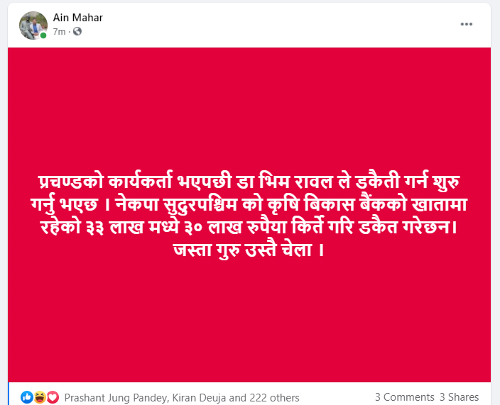 उता नेकपा सुदुरपश्चिमका इन्चार्ज डा भीमबहादुर रावलले पार्टीको खाताबाट ३० लाख रूपैयाँ गायव पारेको आरोप लागेको छ । अनेरास्ववियूका संयोजक ऐन महरले रावले प्रचण्डको कार्यकर्ता भएपछि नेकपा सुदुरपश्चिमको कृषि बिकास बैंकको खातामा रहेको ३३ लाख मध्ये ३० लाख रुपैया किर्ते गरि डकैत गरेको आरोप लगाएका छन ।