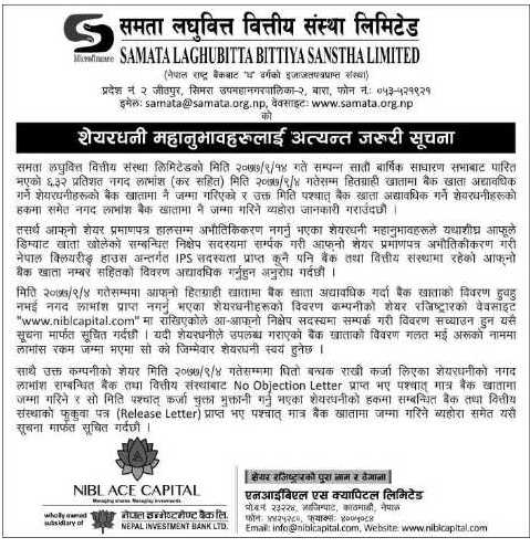 त्यसैगरी, संस्थाले हालसम्म हितग्राही खातामा बैंक खाता अद्यावधिक नगराएका सेयरधनीहरूलाई आफ्नो निक्षेप सदस्यकहाँ सम्पर्क राखि हितग्राही खातामा बैंक खाता अद्यावधिक गराउन अनुराेध गरेकाे छ । संस्थाको शेयर रजिष्ट्रार एनआईबिएल एस क्यापिटल लिमिटेड रहेकाे छ ।