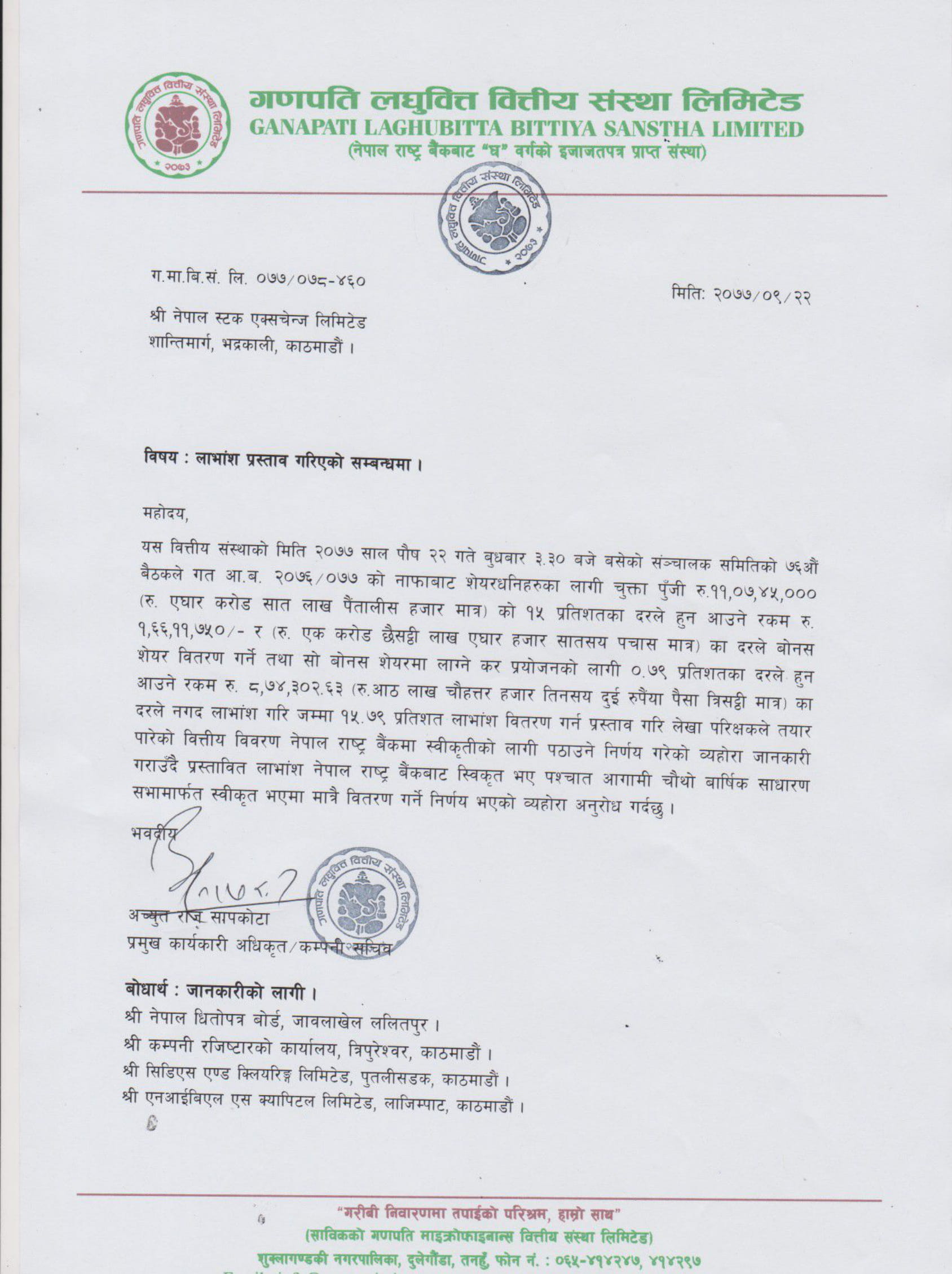 गणपति लघुवित्तले घोषणा गर्याे लाभांश, बोनस शेयर कति ?