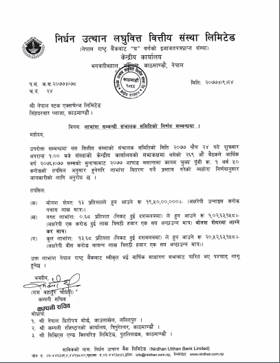 निर्धन उत्थान लघुवित्तले घोषणा गर्यो लाभांश