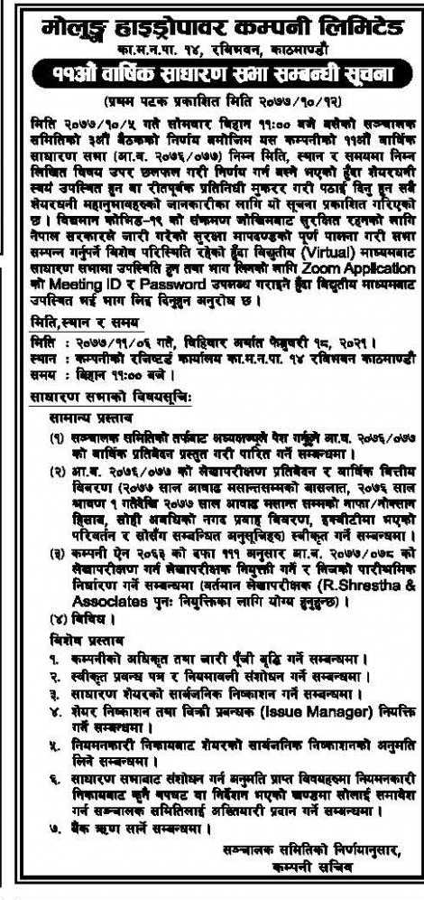 १२ माघ, काठमाडाैँ । मोलुङ्ग हाइड्रोपावर लिमिटेडले साधारण शेयर (आइपिओ) निष्काशन गर्ने भएकाे छ । आइपिओ निष्काशन गर्ने प्रस्ताव सहित मोलुङ्ग हाइड्रोपावर लिमिटेडले ११औं वार्षिक साधारणसभा आह्वान गरेको छ । माघ ५ गते बसेको कम्पनीको संचालक समितिको बैठकले गरेको निर्णयानुसार उक्त सभा फागुन ६ गते कम्पनीको रजिष्टार्ड कार्यालय रविभवनमा बिहान ११ बजे सुरु हुनेछ ।