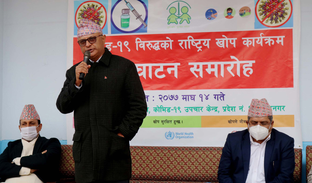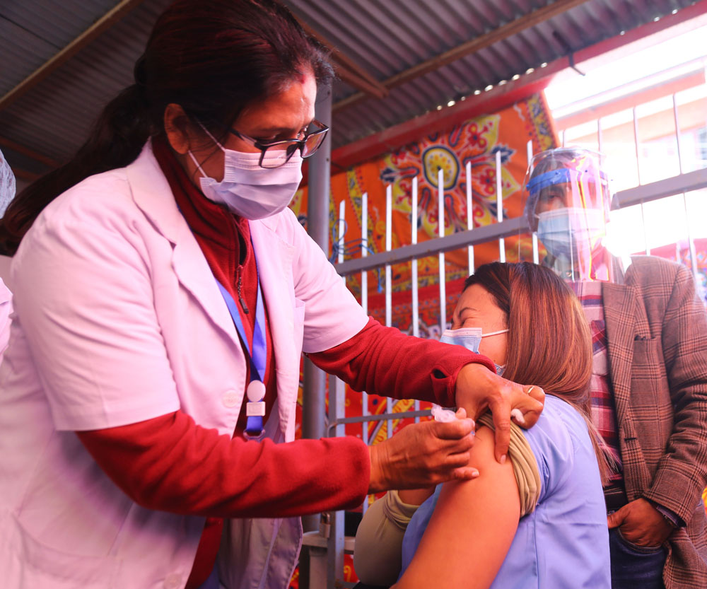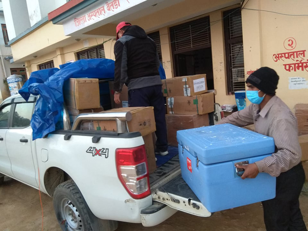 बागलुङमा बुधबारदेखि शुरु भएको कोभिड १९ विरुद्धको खोप अभियानको शुभारम्भ गर्दै प्रमुख जिल्ला अधिकारी सुरेश न्यौपाने । तस्बिरः तारानाथ आचार्य÷रासससङघीय सरकारले पठाएको कोरोनाविरुद्धको खोप बैतडीमा पु¥याउँदै । पहिलो चरणमा दुई हजार २२० डोज खोप जिल्लामा आइपुगेको हो । तस्वीर, विनोद सिंह विष्ट÷राससतनहुँको दमौलीमा बुधबारदेखि शुरु भएको कोभिडविरुद्धको खोप लगाउँदै जिल्ला स्वास्थ्य कार्यालय तनहुँका स्वास्थ्यकर्मी वीरेन्द्रकुमार चौधरी । पहिलो चरणमा तनहुँका एक हजार ६७९ स्वास्थ्यकर्मीलाई खोप लगाइँदैछ । तस्वीर ः कृष्ण न्यौपाने÷ दमौलीप्रधानमन्त्री केपी शर्मा ओली बुधबार बालुवाटारमा भर्चुअल विधिबाट खोपको शुभारम्भ गर्दै । तस्वीरः प्रदीप वन्त/राससप्रधानमन्त्री केपी शर्मा ओली बुधबार बालुवाटारमा भर्चुअल विधिबाट कोभिड१९ विरुद्ध खोपको शुभारम्भपछि सम्बोधन गर्नुहुँदै । तस्वीरः प्रदीप वन्त/राससतनहुँको दमौलीमा बुधबारदेखि शुरु भएको कोभिडविरुद्धको खोप लगाउँदै दमौली अस्पतालका स्वास्थ्यकर्मी पार्वती श्रेष्ठ । पहिलो चरणमा तनहुँका एक हजार ६७९ स्वास्थ्यकर्मीलाई खोप लगाइँदैछ । तस्वीर ः कृष्ण न्यौपाने/दमौलीबागलुङमा बुधबारदेखि शुरु भएको कोभिड १९ विरुद्धको खोप अभियानको शुभारम्भ गर्दै प्रमुख जिल्ला अधिकारी सुरेश न्यौपाने । तस्बिरः तारानाथ आचार्य/राससकोशी अस्पताल कोभिड१९’ उपचार केन्द्र विराटनगरमा बुधबारदेखि शुरु भएको कोभिडविरुद्धको खोप कार्यक्रममा लगाइने कोभिशिल्ड’ । तस्बिरः मनोज दाहाल/राससप्रदेश नं १ का सामाजिक विकास एवं आन्तरिक मामिला तथा कानुनमन्त्री हिक्मतकुमार कार्की कोशी अस्पताल कोभिड१९’उपचार केन्द्र विराटनगरमा बुधबार कोभिडविरुद्धको खोप शुभारम्भ कार्यक्रममा मन्तव्य व्यक्त गर्दै । तस्बिरः मनोज दाहाल/राससकाठमाडौँको शुुक्रराज ट्रपिकल तथा सरुवा रोग अस्पताल टेकुु खोप केन्द्रमा कोभिडविरुद्धको खोप लागाउँदै चिकित्सक । पहिले चरणमा फोहरमैला व्यवस्थापनमा खटिने फोहर सङकलक तथा चालक, एम्बुलेन्स, शववाहन चालक र सहचालक, स्वास्थ्यकर्मी, खोप केन्द्रमा खटिने सुरक्षाकर्मी, स्वयंसेवक, शव व्यवस्थापनमा खटिने व्यक्ति, स्वास्थ्य स्वयंसेविका, वृद्धवृद्धा, कैदी र सुरक्षाकर्मीलाई खोप दिइने छ । तस्बिरः रोशन सापकोटा/रासस