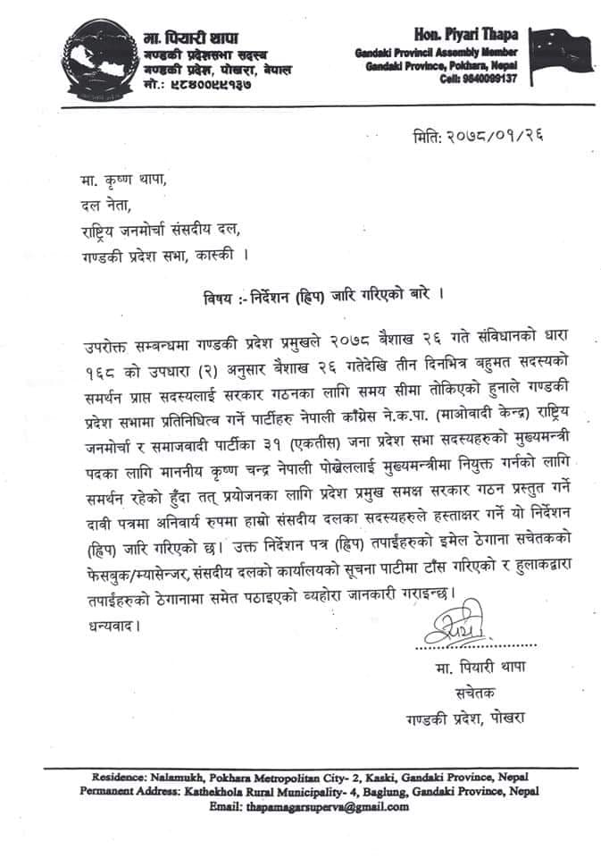 गण्डकीमा जनमोर्चाकी पियारीद्धारा संसदीय दलको नेतालाई नै जानकारी नदिइ ह्वीप जारी