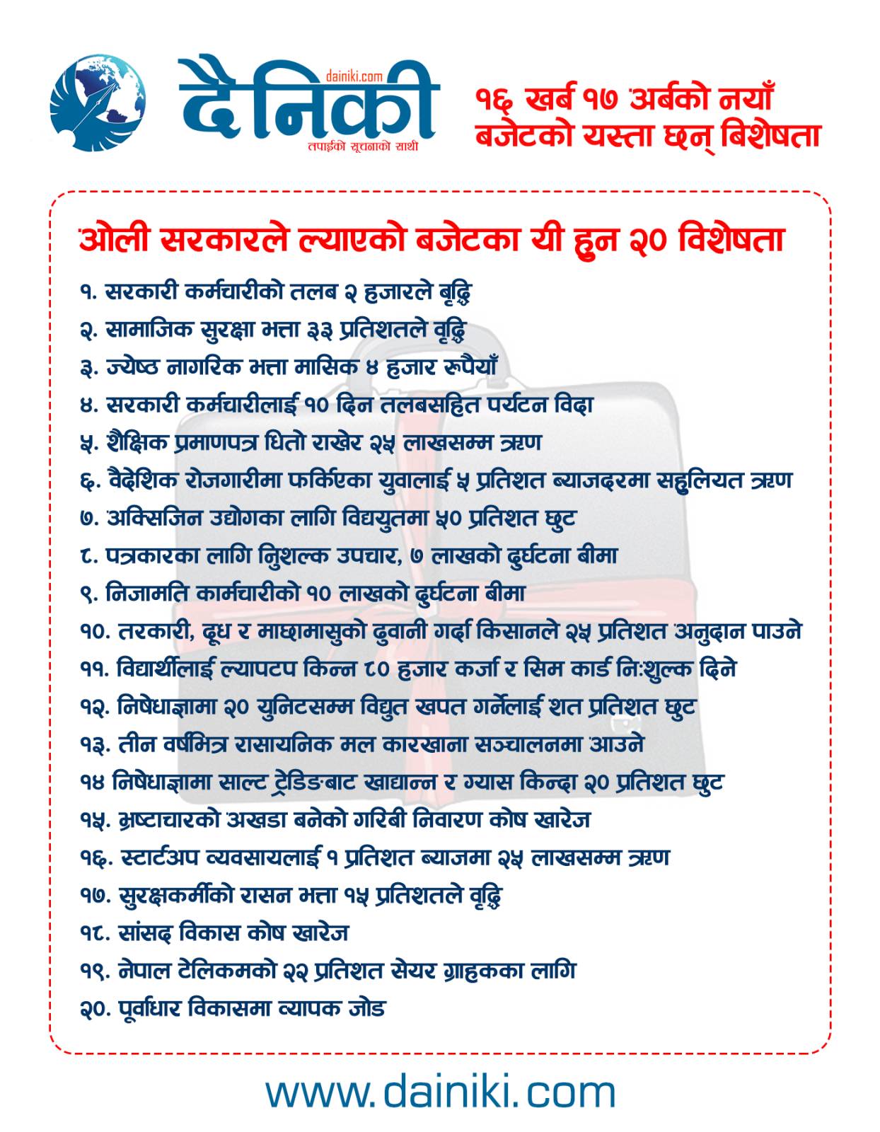 अर्थमन्त्री विष्णुप्रसाद पौडेलले १६ खर्ब ४७ अर्ब रुपैयाँको बजेट घोषणा गर्नुभएको छ जुन बजेटले आगामी निर्वाचन समेत प्रभावित हुने भन्दै विपक्षी नेताहरूले बिरोधी प्रतिक्रिया दिएका छन । बजेटले कर्मचारीको तलब बढाउने, वृद्ध भत्ता बढाउने र सामाजिक सुरक्षा भत्ता बढाउने लगायतका महत्वपूर्ण र लोकप्रिय कार्यक्रम अघि ल्याएको छ ।