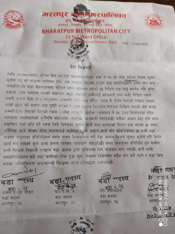 वडा सदस्यहरु कमलबहादुर गोदार, पार्वती विक, गौरी जमरकट्टेल र युवराज महतोले सोमबार संयुक्त विज्ञप्ति जारी गर्दै अध्यक्ष भुजेलले काम गरिदिएबापत पाँच लाख रूपैयाँ लिएको जानकारी दिनुभएको छ । भरतपुर–२५, शुक्रनगरका लीलाराज महतो र आशा चौधरीबीच अंशबन्डाको लेनदेनमा वडा अध्यक्ष भुजेलले मध्यस्थकर्ताको भूमिका खेल्दै पैसा बुझेका हुन । भुजेलले स्वयम् आशा चौधरीले पाँच लाख रूपैयाँ रकम लिएको बताउनुभएको छ । अध्यक्ष भुजेलले भने राजनीतिक रिसइबीका कारण वडा सदस्यहरुले नै आफ्नो विरोध गरेको बताएका छन् ।