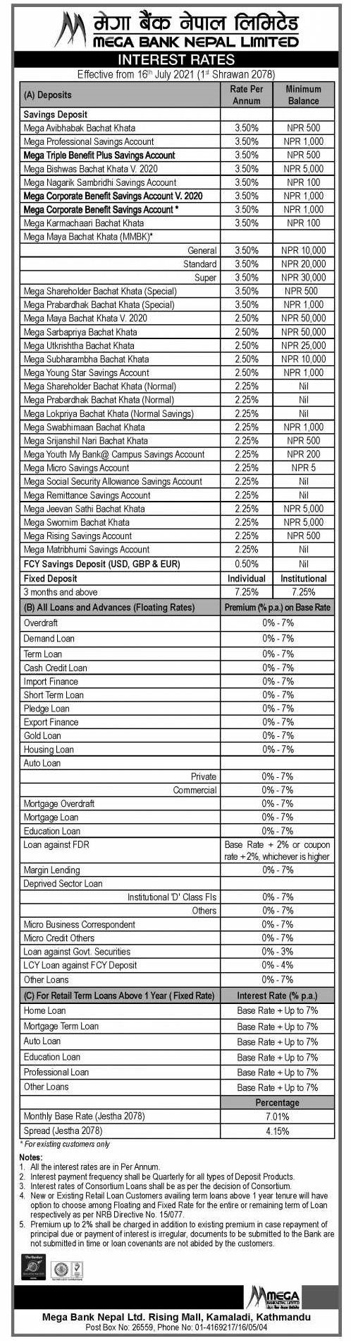 मेगा बैंकले सार्वजनिक गर्याे नयाँ ब्याजदर