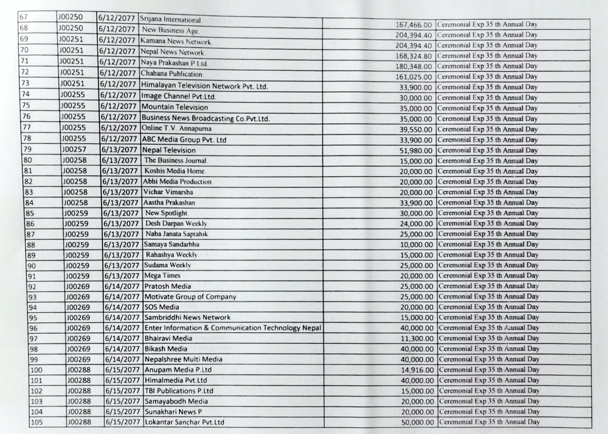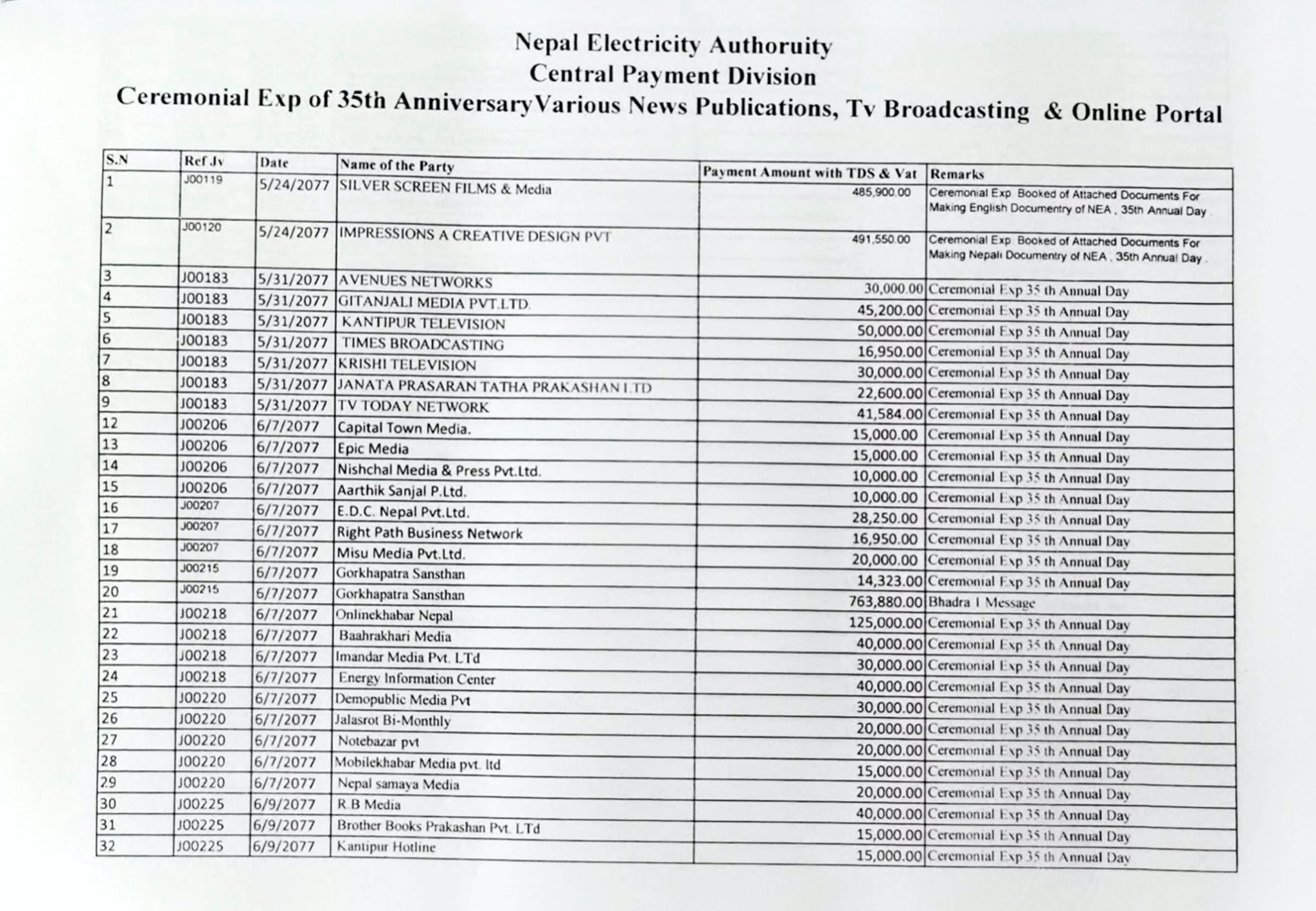 ७ भदाै, काठमाडाैँ । भारतबाट बिजुली आयात गरेर लोडसेडिङ अन्त्यको चर्चा बटुलेका नेपाल विद्युत् प्राधिकरणका कार्यकारी निर्देशक कुलमान घिसिङले पुन नयाँ फण्डा बाहिर आएको छ । उनले प्राधिकरणको ३५ औँ वार्षिकोत्सवमा मात्रै मिडियालाई विज्ञापनबापत झण्डै १ करोड रुपैयाँ खर्चिएको रहस्य बाहिर आएको हो ।