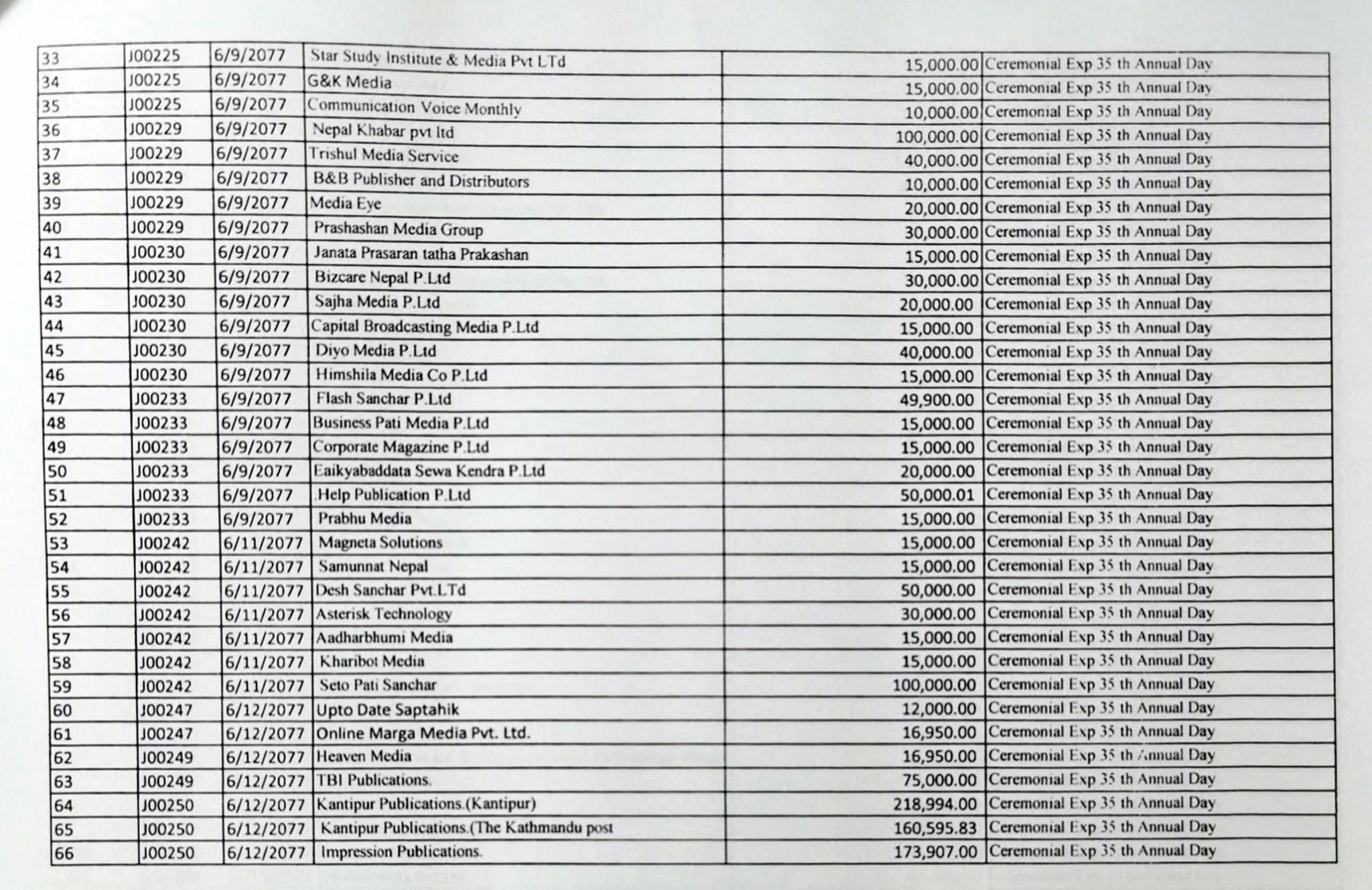 उनले गोरखापत्रलाई एउटै कार्यक्रमबापत ७ लाख रुपैयाँभन्दा बढी रकम दिएका छन । त्यसैगरी, दोस्रो धेरै पैसा लिनेमा कान्तिपुर मिडिया ग्रुप छ । उसले एउटै साधारणसभाबाट झण्डै ४ लाख रुपैयाँभन्दा बढी पैसा लिएको हो । न्यू बिजनेस एज, कामना प्रकाशन प्रालि, नागरिक दैनिक र नयाँ पत्रिकासहित घिसिङले १ सय ४४ वटा मिडियालाई रकम उपलब्ध गराएको देखिएको छ । यो सम्पूर्ण विवरण एउटै कार्यक्रमको हो ।
