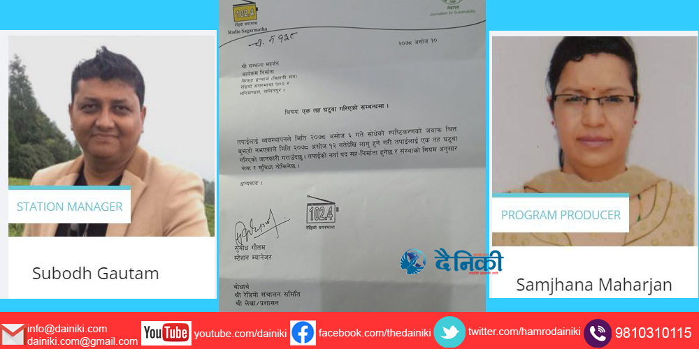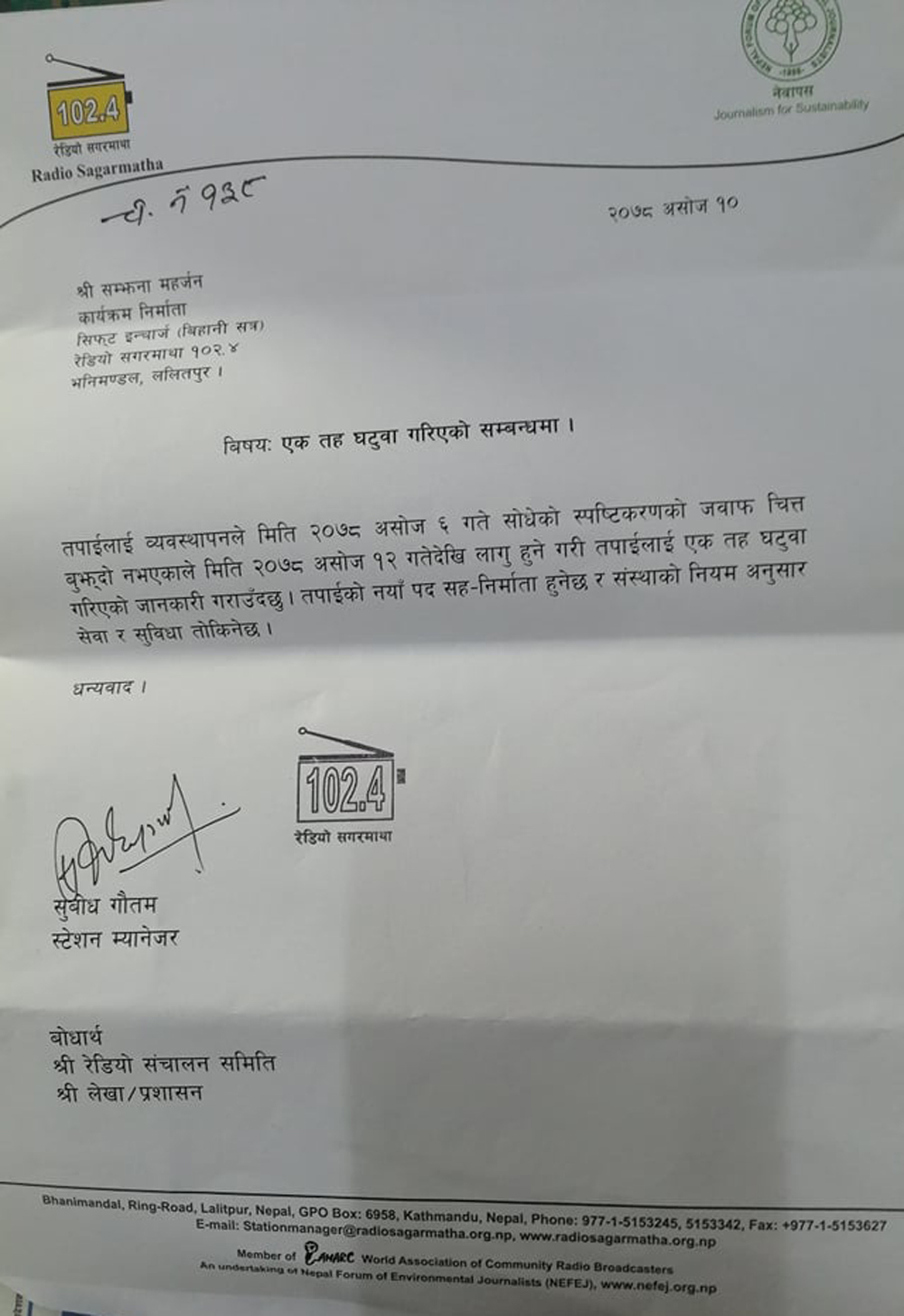 हामीले स्टेशन म्यानेजर सुवोध गौतमसँग चासो राख्यौँ । गौतमकै हस्ताक्षर गरेको पत्रबाट सोही स्टेशनमा कार्यरत कार्यक्रम निर्माता सम्झना महर्जनको एक तह घटुवा भएको देखिन्छ । यद्यपी गत शुक्रबार बसेको सञ्चालक समितिको बैठकले स्टेशन म्यानेजरले गरेको कारबाही फिर्ता लिँदै महर्जनलाई अन्तिम एक पटकका लागि मौका दिने निर्णय गरिसकेको गौतमले बताए ।