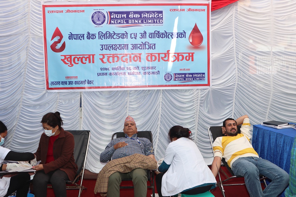 नेपाल बैंकको आयोजना तथा लायन्स क्लब अफ काठमाडौँ बैंकरको सहयोगमा उक्त रक्तदान कार्यक्रम सम्पन्न भएको थियो । त्यसैगरी बैंकले देशका विभिन्न भागमा आर्थिक, सांस्कृतिक, सामाजिक, वातावरणीय, सरसफाई, शैक्षिक, स्वस्थ्य, वित्तीय साक्षरताका कार्यक्रम पनि गरेको छ।