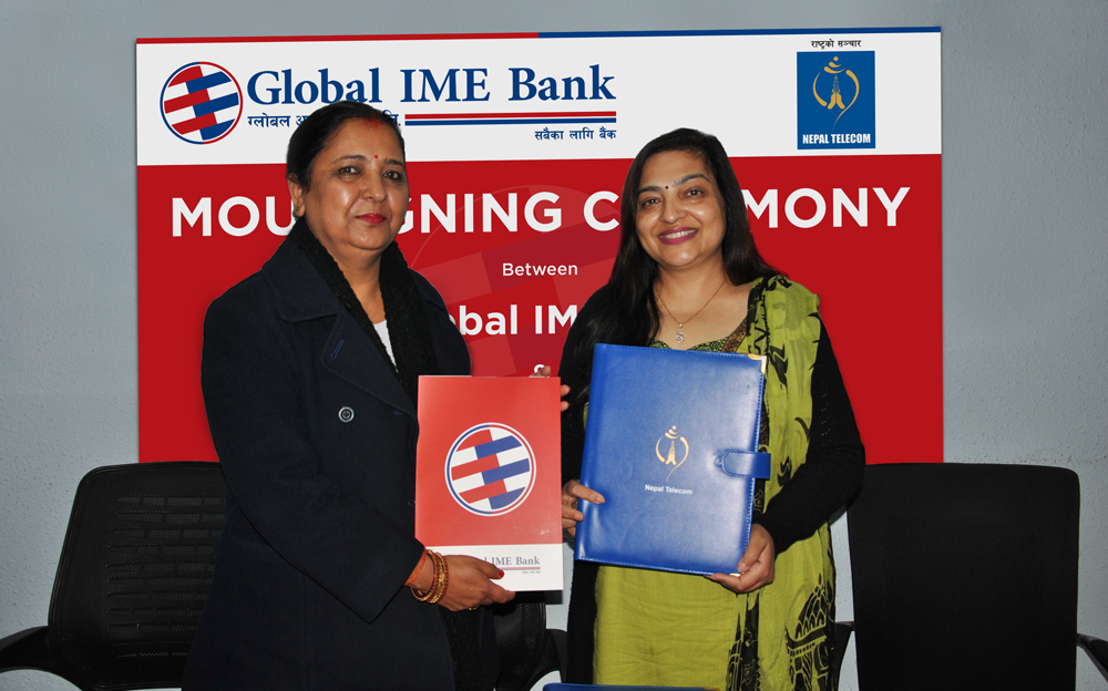 समझदारी पत्रमा ग्लोबल आइएमई बैंक लिमिटेडको बजार तथा व्यवसाय प्रवद्र्धन प्रमुख शान्ता शिवाकोटी र नेपाल टेलिकमको तर्फबाट प्रमुख व्यापार अधिकृत संगीता पहाडीले हस्ताक्षर गरेका छन् । बैंकले समय–समयमा यस्ता विभिन्न किसिमका योजनाहरु ल्याई आफ्ना ग्राहकहरुलाई विस्तारित बैंकिङ्गका साथसाथै अन्य सेवाहरु प्रदान गर्दै आएको छ ।