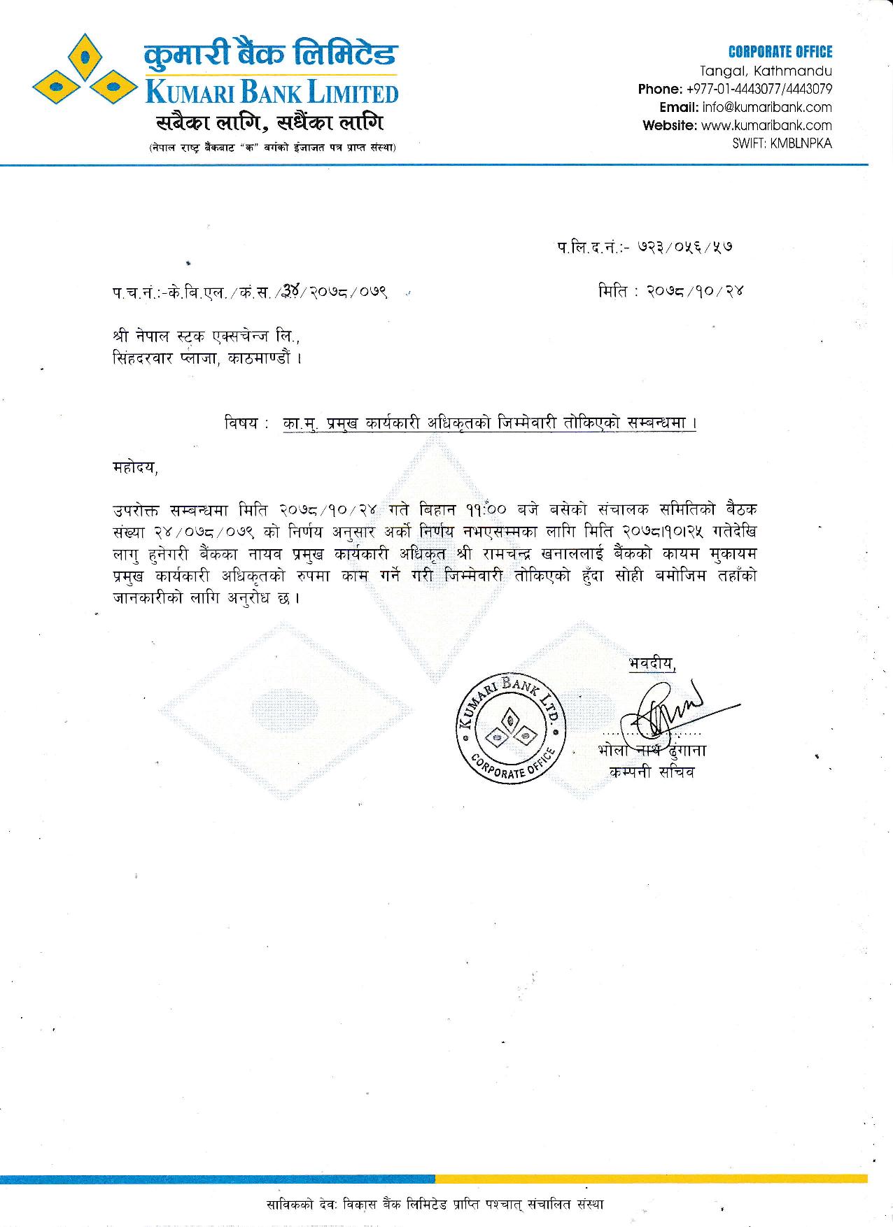 २४ माघ, काठमाडौं । कुमारी बैंक लिमिटेडको कायम मुकायम प्रमुख कार्यकारी अधिकृत (सिईओ) मा रामचन्द्र खनाल नियुक्त भएका छन् । सोमबार बसेको सञ्चालक समितिको बैठकले बैंकको सिईओमा अर्को निर्णय नभएसम्मका लागि खनाललाई नियुक्त गर्ने निर्णय गरेको हो । उनी माघ २५ गते मंगलबारदेखि लागू हुनेगरी जिम्मेवारी सम्हाल्ने छन् ।