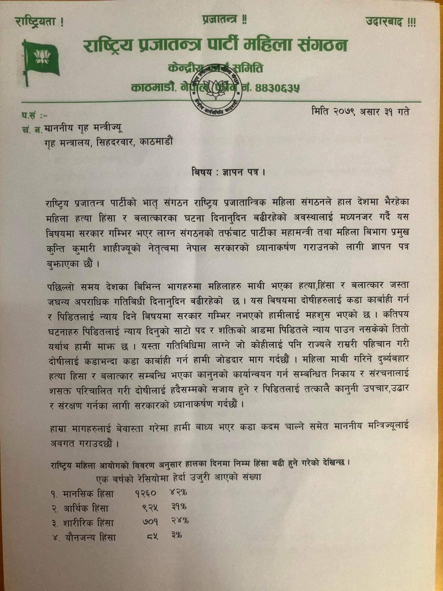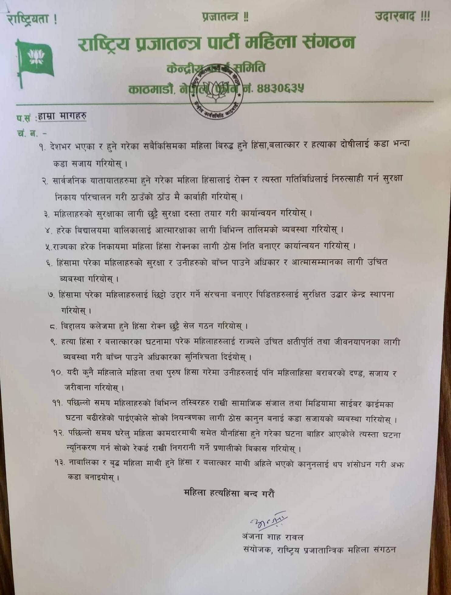 महिला सुरक्षाको मागसहित राप्रपानिकट महिला संगठनले बुझायो गृहमन्त्री खाणलाई ज्ञापनपत्र