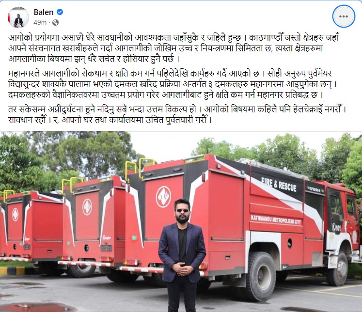 सकेसम्म अग्नी दुर्घटना हुनै नदिनु सबै भन्दा उत्तम विकल्प भएको जनाउँदै उनले आगोको बिषयमा कहिलै पनि हेलचेक्राइँ नगर्न सबैलाई अनुरोध गरेका छन् । ‘आगोको प्रयोगमा असाध्यै धेरै सावधानीको आवश्यकता जहाँसुकै र जहिलै हुन्छ । काठमाडौं जस्तो क्षेत्रहरु जहाँ आफ्नै संरचनागत खराबीहरुले गर्दा आगलागीको जोखिम उच्च र नियन्त्रणमा सिमितता छ, त्यस्ता क्षेत्रहरुमा आगलागीका बिषयमा झन् धेरै सचेत र होसियार हुनै पर्छ,’ काठमाडौं महानगरपालिकाका प्रमुख शाहले भनेका छन् ।