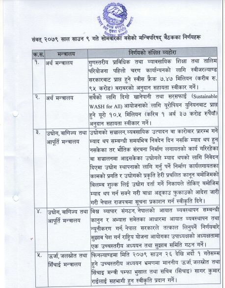 यस्ता छन् मन्त्रिपरिषद् बैठकका १२ निर्णय