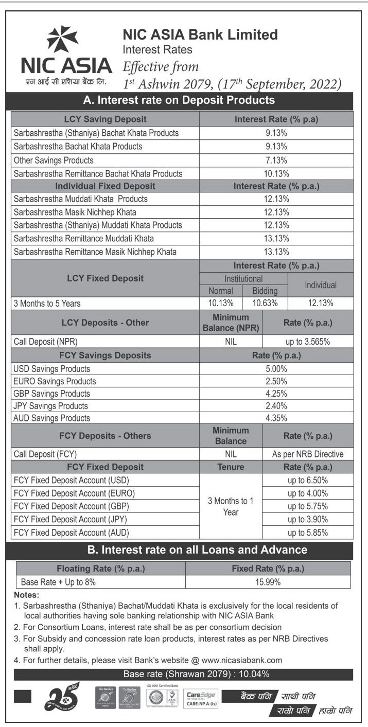 ३१ भदाै, काठमाडौं । एनआईसी एशिया बैंकले नयाँ व्याजदर सार्वजनिक गरेको छ । बैंकले विभिन्न खातामा भोलि (असोज १ गते, शनिबार) बाट लागु हुने गरी नयाँ व्याजदर सार्वजनिक गरेको हो । बैंकले सार्वजनिक गरेको नयाँ ब्याजदर अनुसार व्यक्तिगत मुद्दती निक्षेपकर्ताले १२.१३ प्रतिशत ब्याज पाउने भएका छन् ।