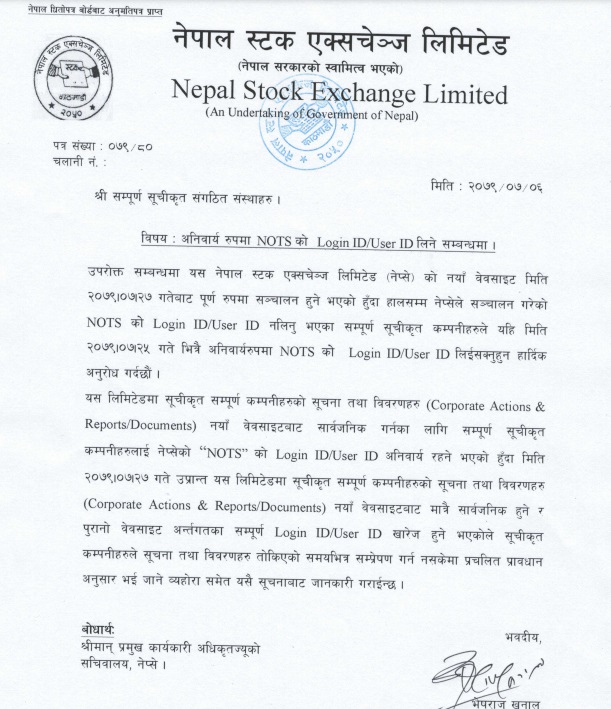 कम्पनीहरुको सूचना तथा विवरणहरु नयाँ वेबसाइटबाट सार्वजनिक गर्नका लागि सम्पूर्ण सूचीकृत कम्पनीहरुलाई नेप्सेको नट्सको लगइन र युजर आईडी अनिवार्य रहेको हुनाले लिन कम्पनीहरूलाई अनुराेध गरेकाे छ ।