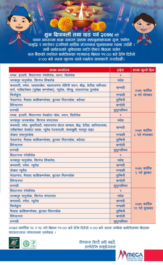 तिहार बिदामा मेगा बैंकका यी शाखाहरु संचालन हुने