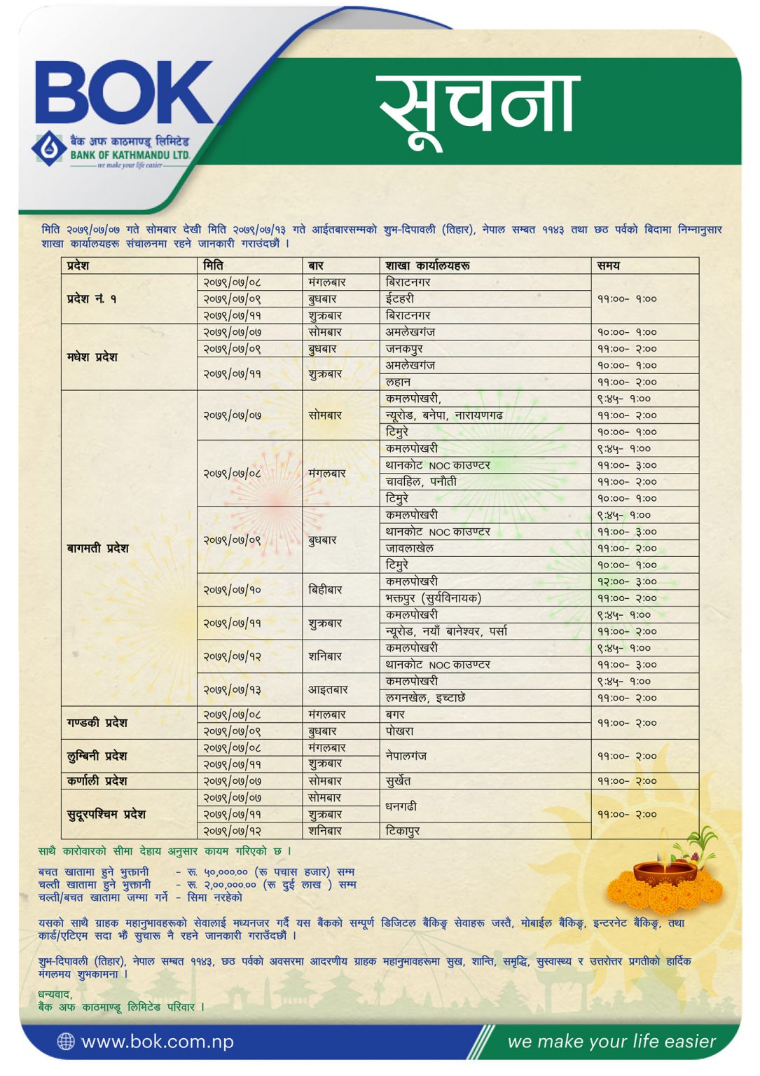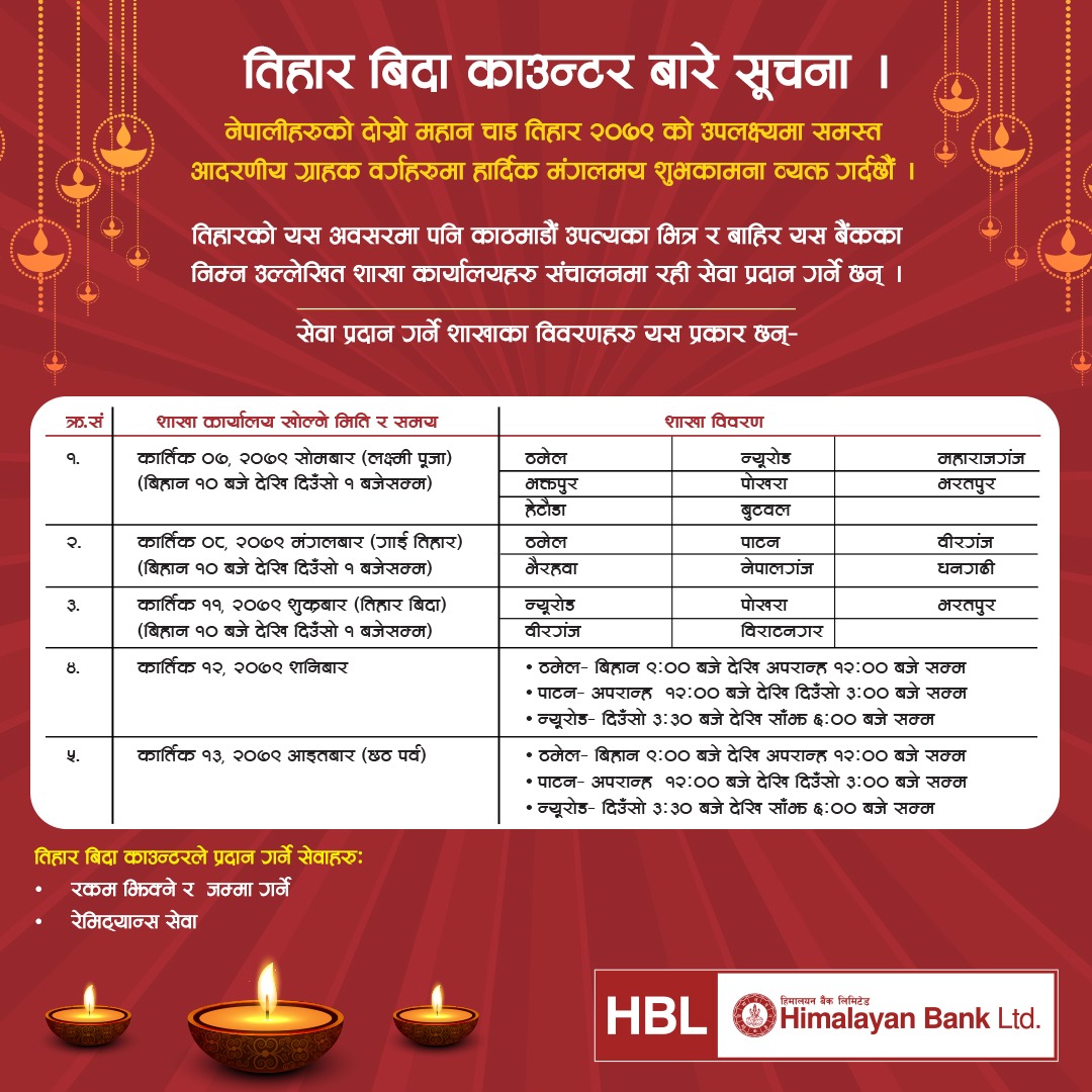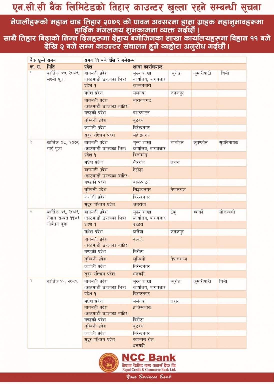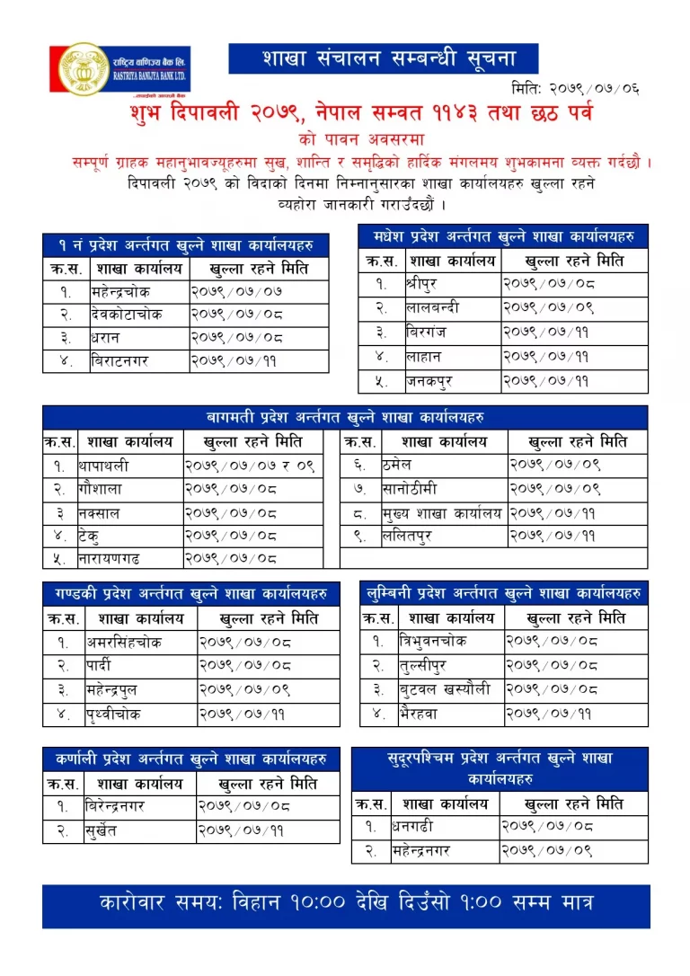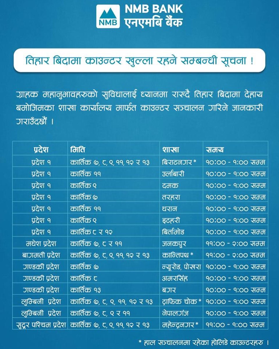 बैंकहरुले आज लक्ष्मी पुजाको दिनदेखि १० गते भाई टिकाको दिन र १२ गते शनिबार तथा १३ गते छठ पर्वको दिनमा पनि सेवा दिने भएका हुन् । बैंकहरुले काठमाडौं उपत्यकासहित देशै भरका विभिन्न शाखाबाट छुट्टा छुट्टै दिन सेवा दिने भएका छन् ।