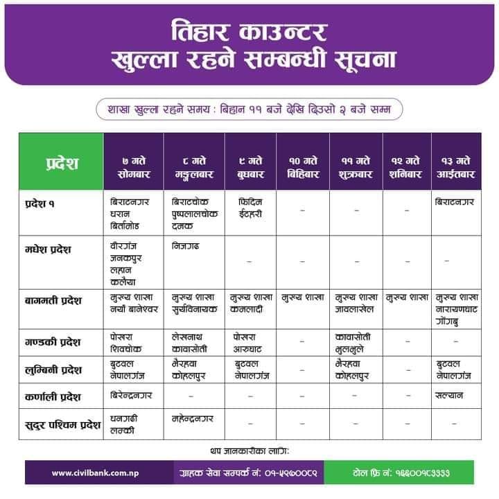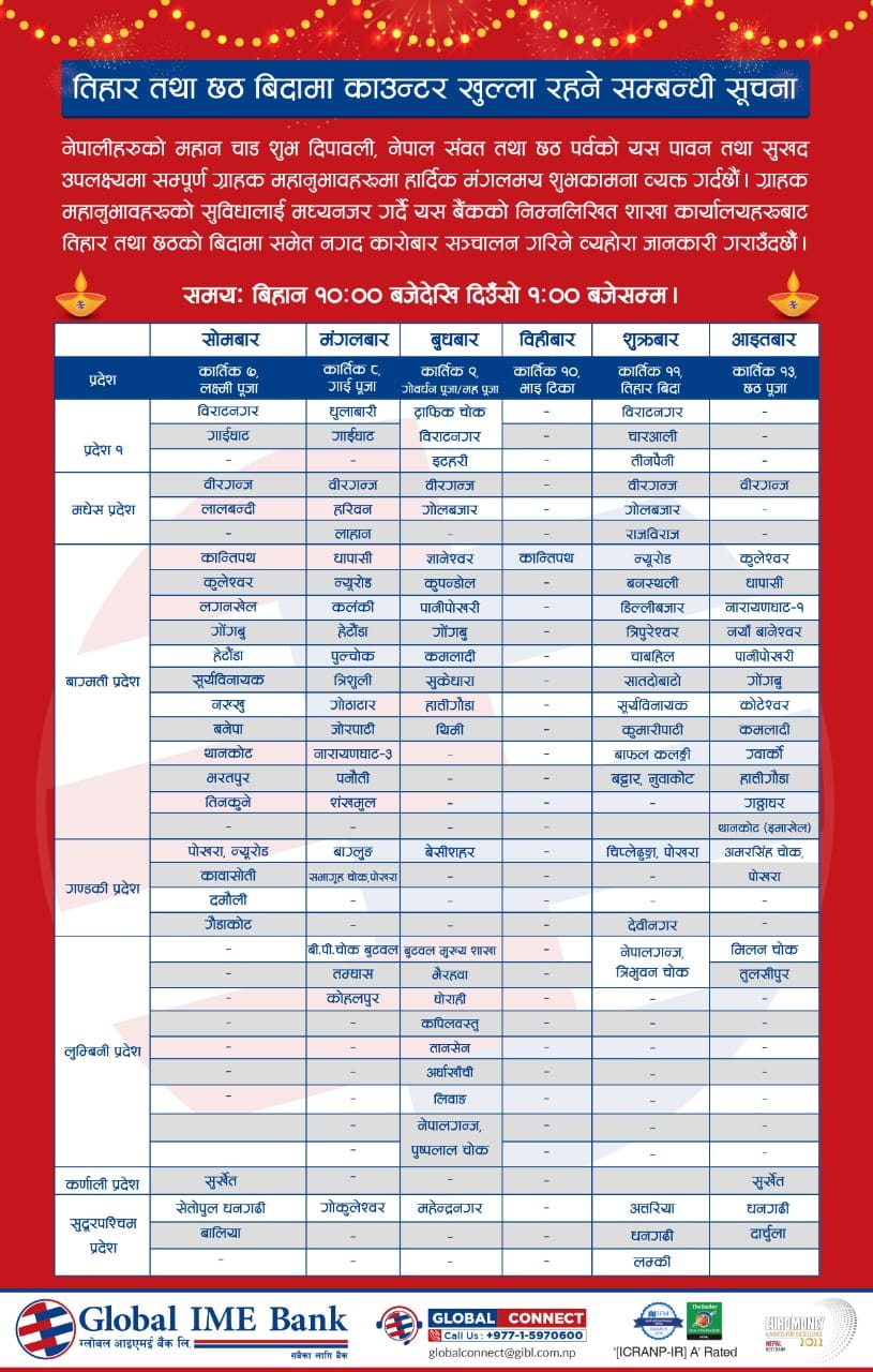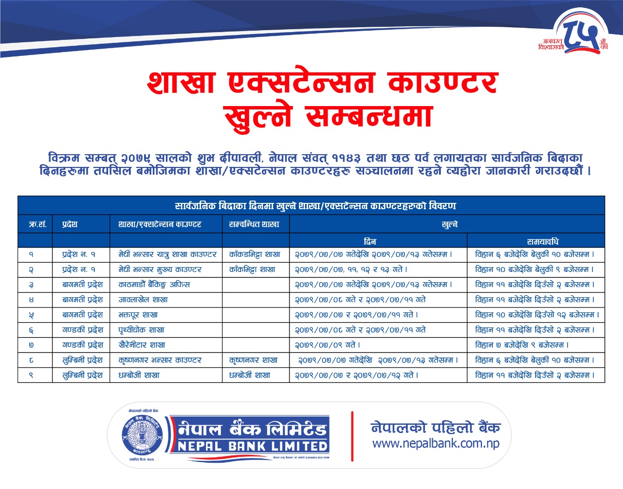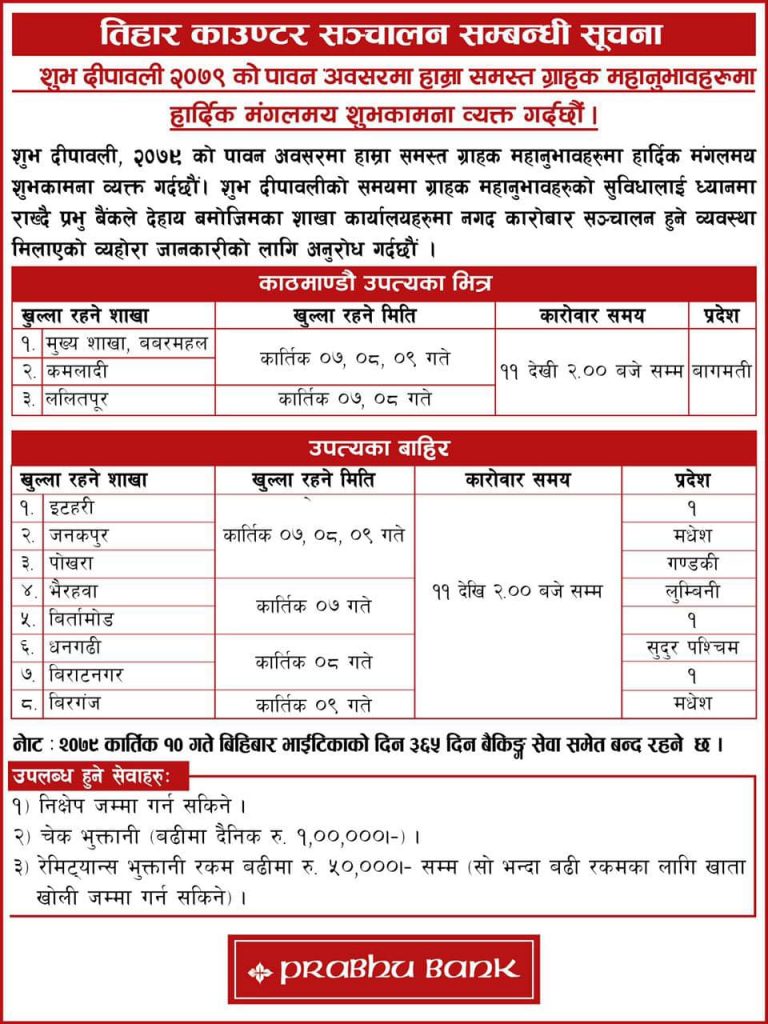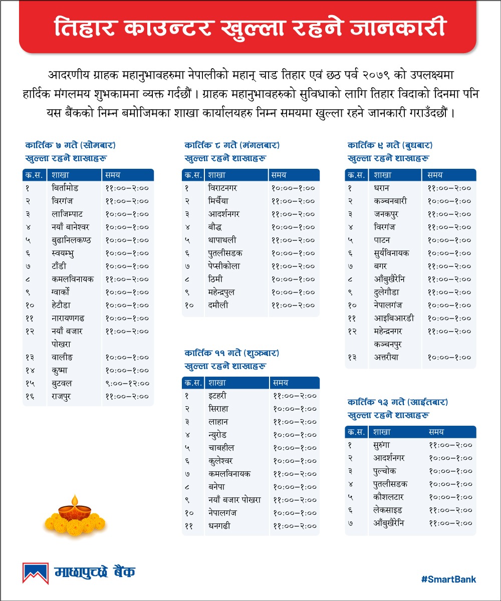 बैंकहरुले आज लक्ष्मी पुजाको दिनदेखि १० गते भाई टिकाको दिन र १२ गते शनिबार तथा १३ गते छठ पर्वको दिनमा पनि सेवा दिने भएका हुन् । बैंकहरुले काठमाडौं उपत्यकासहित देशै भरका विभिन्न शाखाबाट छुट्टा छुट्टै दिन सेवा दिने भएका छन् ।