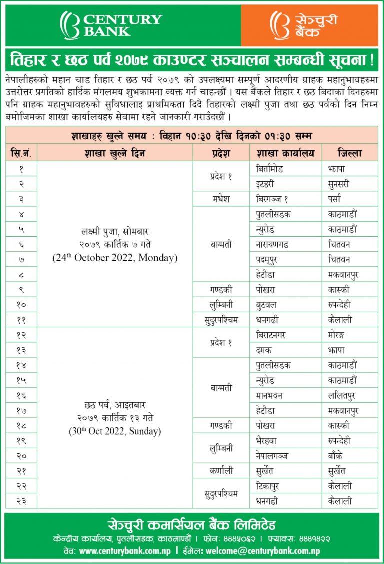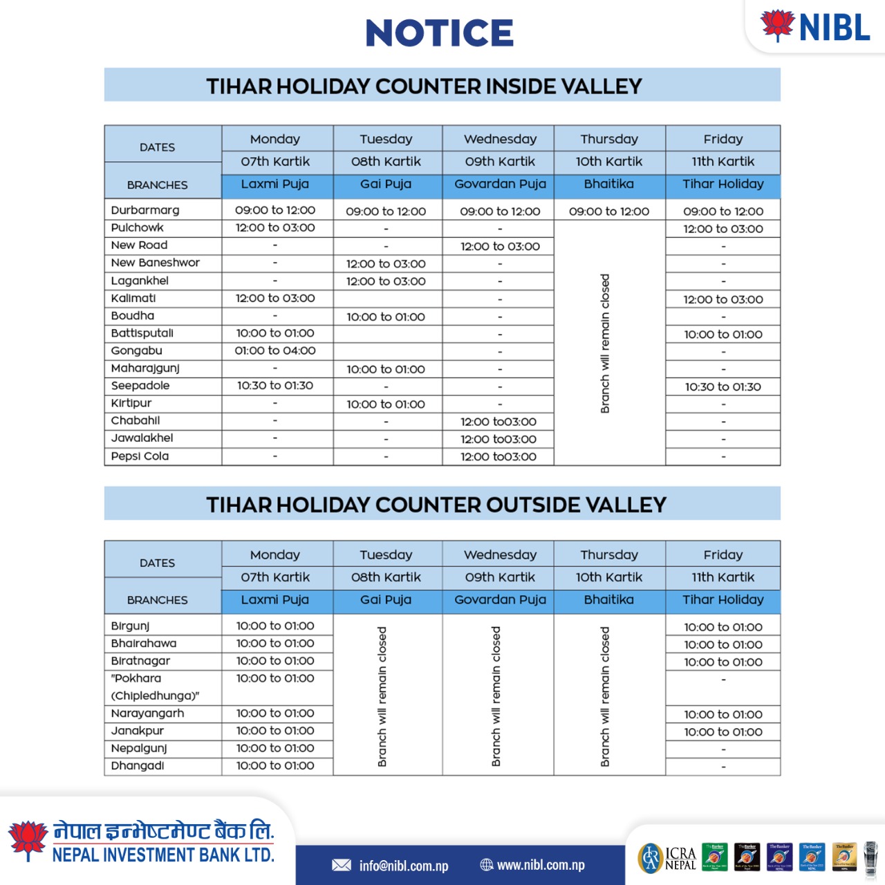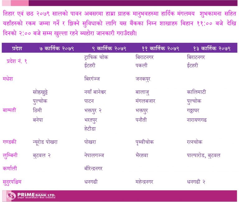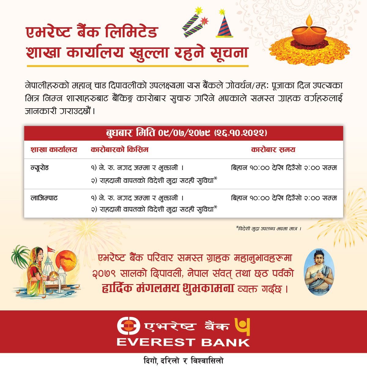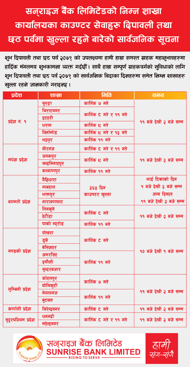 बैंकहरुले आज लक्ष्मी पुजाको दिनदेखि १० गते भाई टिकाको दिन र १२ गते शनिबार तथा १३ गते छठ पर्वको दिनमा पनि सेवा दिने भएका हुन् । बैंकहरुले काठमाडौं उपत्यकासहित देशै भरका विभिन्न शाखाबाट छुट्टा छुट्टै दिन सेवा दिने भएका छन् ।