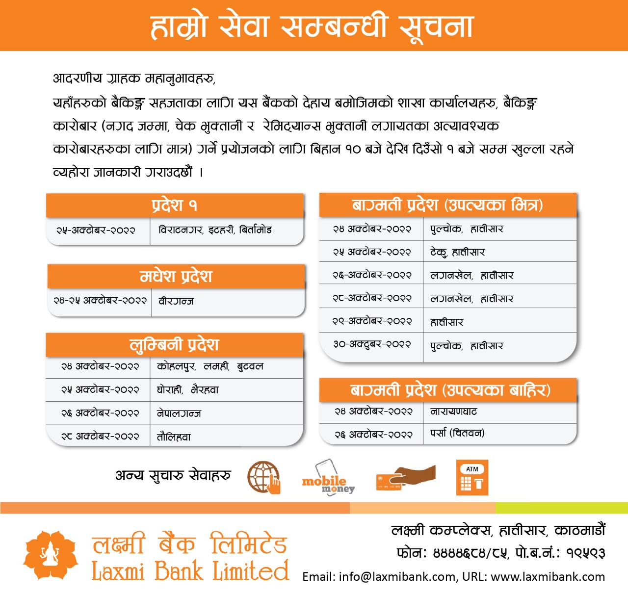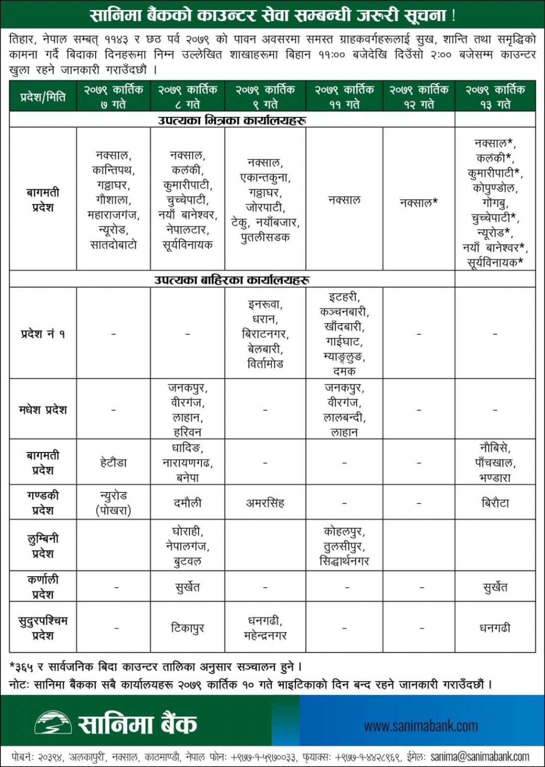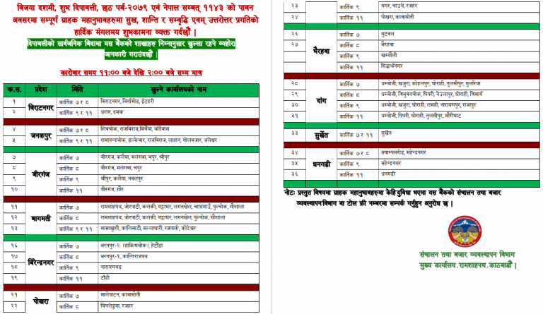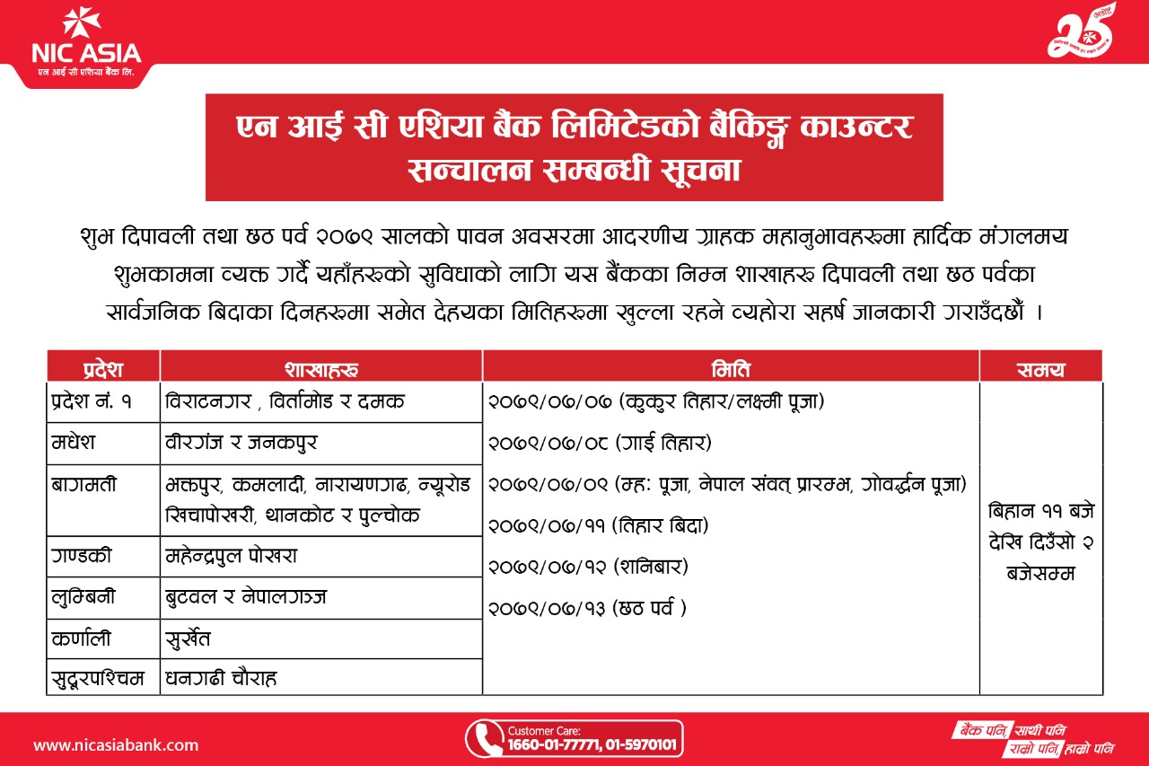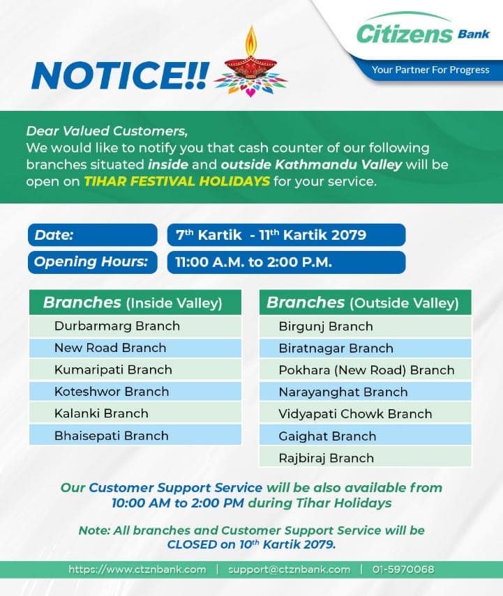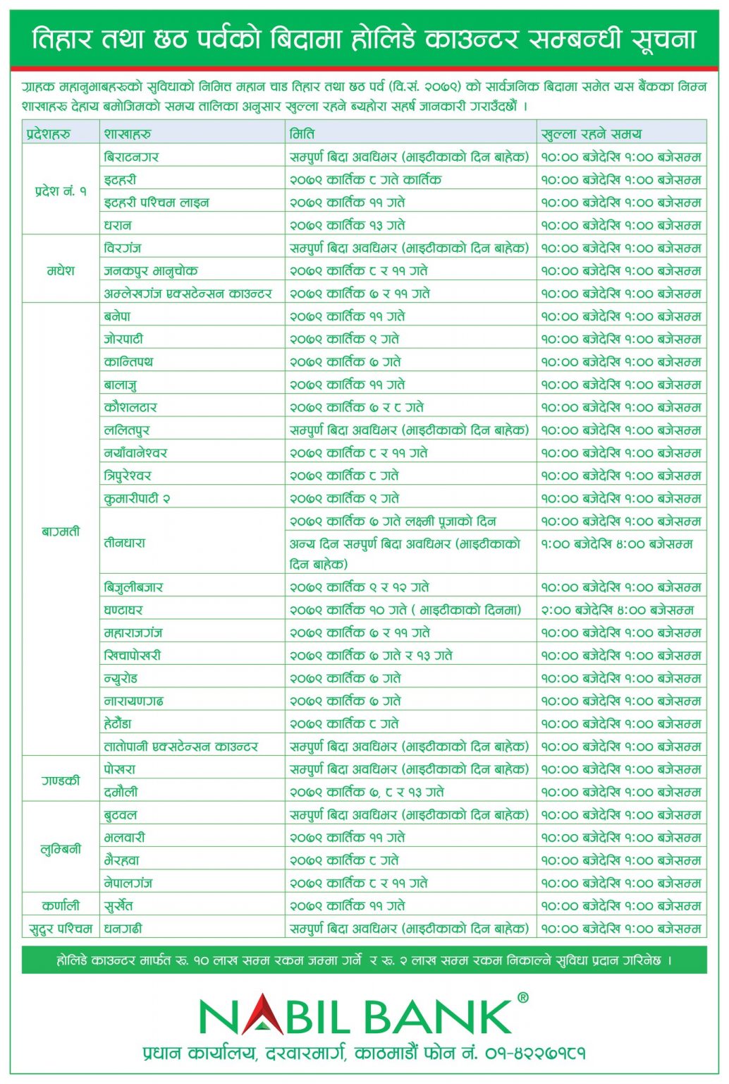बैंकहरुले आज लक्ष्मी पुजाको दिनदेखि १० गते भाई टिकाको दिन र १२ गते शनिबार तथा १३ गते छठ पर्वको दिनमा पनि सेवा दिने भएका हुन् । बैंकहरुले काठमाडौं उपत्यकासहित देशै भरका विभिन्न शाखाबाट छुट्टा छुट्टै दिन सेवा दिने भएका छन् ।