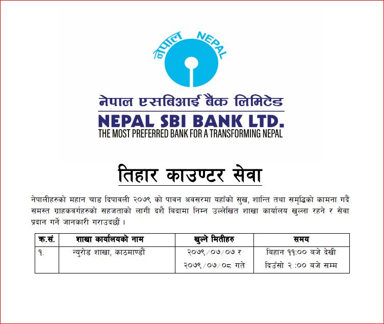 ७ कार्तिक, काठमाडौं । वाणिज्य बैंकहरुले तिहारको बिदाकाे समयमा पनि सेवाग्राहीलाई सेवा दिने भएका छन् । सबै वाणिज्य बैंकहरुले सूचना निकालेर तिहारको बिदामा पनि सेवा दिने जनाएका हुन् ।