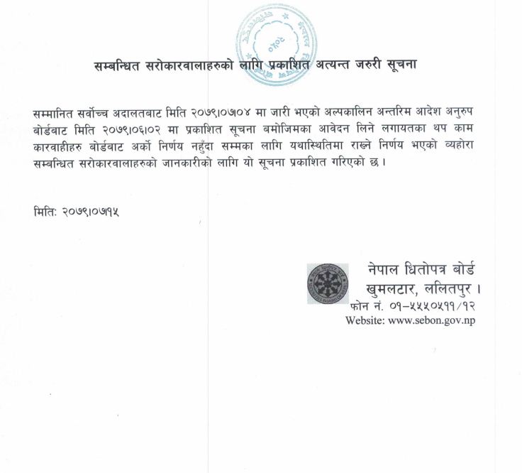कात्तिक ४ गते सर्वोच्च अदालतबाट जारी भएको अल्पकालिन अन्तरिम आदेश अनुरुप बोर्डबाट असोज २ मा प्रकाशित सूचना बमोजिमका आवेदन लिने लगायतका थप काम कारबाहीहरु बोर्डबाट अर्को निर्णय नहुँदासम्मका लागि यथास्थितीमा राख्ने निर्णय भएको बाेर्डले जनाएकाे छ ।