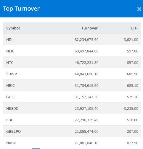 त्यस्तै, नेपाल नेपाल लाइफ इन्स्योरेन्सको ६ करोड ४ लाख, एनटिसीको ४ करोड ६७ लाख, शिवम् सिमेन्ट्सको ४ करोड ४८ लाख र नेपाल पुनर्बीमा कम्पनीको ३ करोड १७ लाख रुपैयाँमाथिको कारोबार भएको छ ।