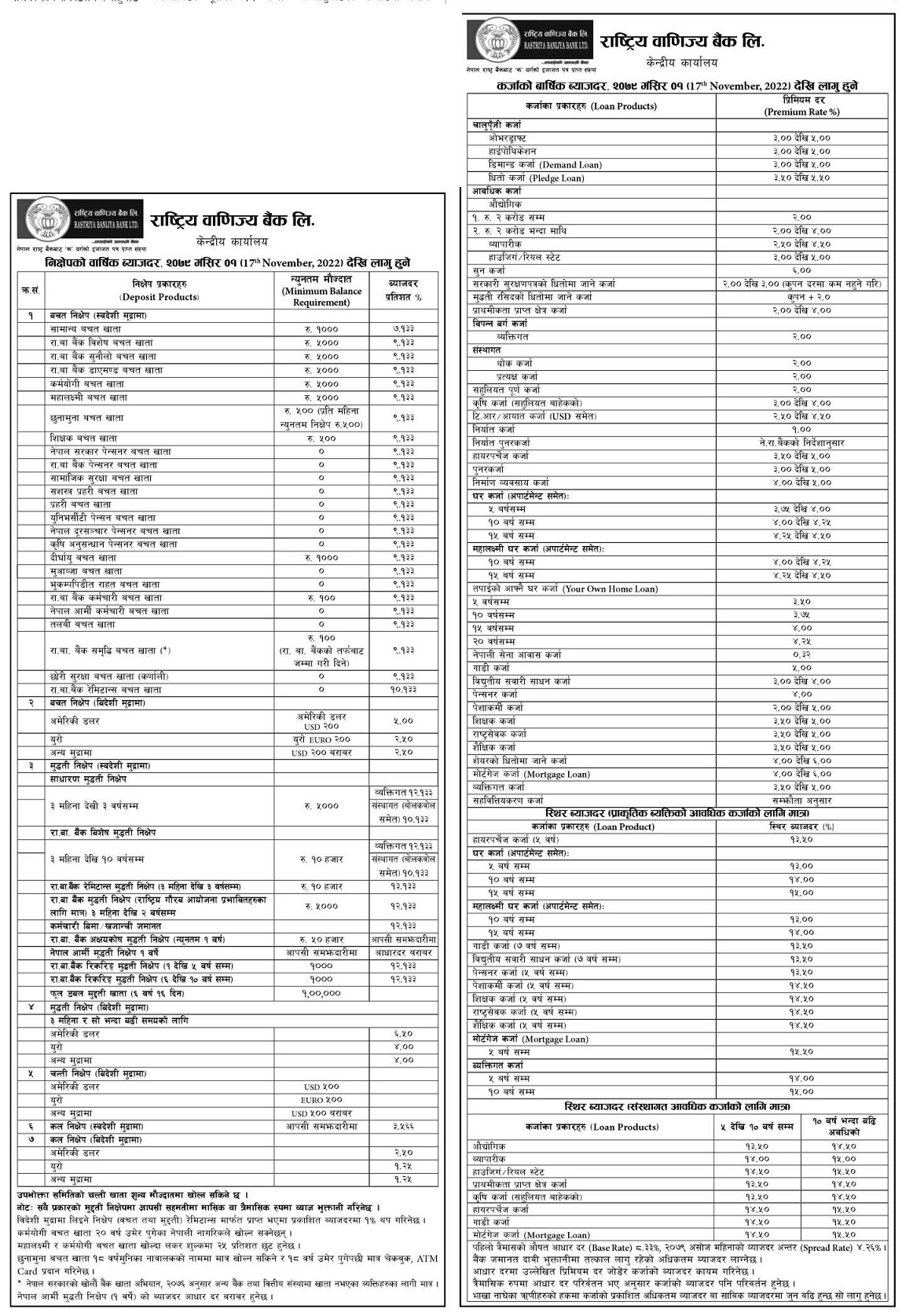१ मंसिर काठमाडाैं । राष्ट्रिय वाणिज्य बैंक लिमिटेडले विभिन्न खातामा नयाँ व्याजदर सार्वजनिक गरेको छ । बैंकले आज मंसिर १ गते बिहिबारदेखि विभिन्न खातामा लागु हुने गरी नयाँ व्याजदर सार्वजनिक गरेको हो । मंसिर महिनाका लागि पनि बैंकले असोज महिनामा कायम ब्याजदरलाई नै निरन्तरता दिएको छ ।