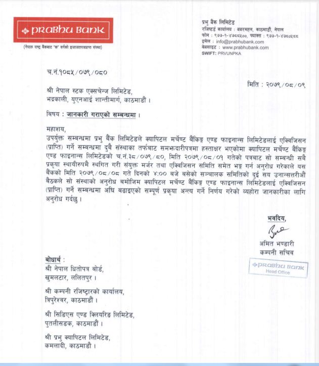 सोही अनुरोधबमोजिम प्रभु बैंक सञ्चालक समितिको मंसिर ८ गते बसेको सञ्चालक समितिको बैठकले क्यापिटल मर्चेन्ट बैंकिलाई  प्राप्ति गर्ने सम्बन्धमा अघि बढाइएको सम्पूर्ण प्रकृया अन्त्य गर्ने निर्णय गरेको कम्पनीले जारी गरेकाे विज्ञप्तिमा उल्लेख छ।