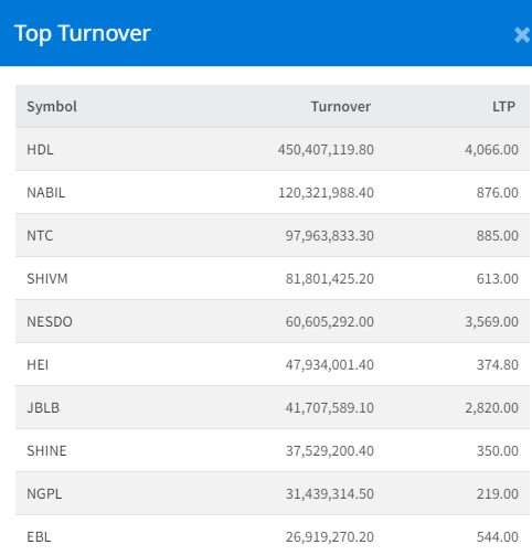 त्यस्तै, नबिल बैंकको १२ करोड ३ लाख, एनटिसिको ९ करोड ७९ लाख, शिवम् सिमेन्ट्सको ८ करोड १८ लाख र नेष्डो समृद्ध लघुवित्तको ६ करोड ६ लाख रुपैयाँमाथिको कारोबार भएको छ ।