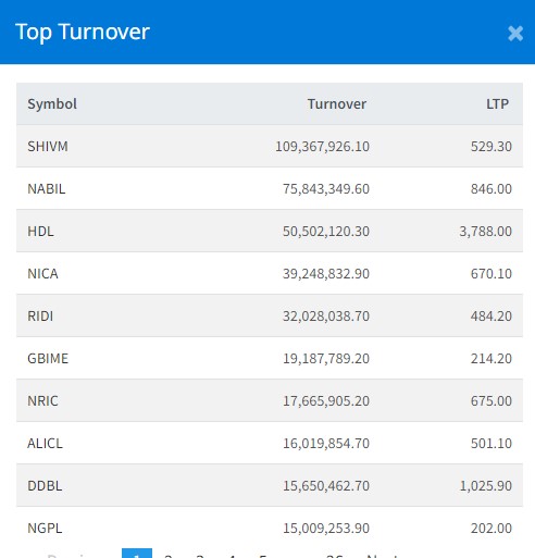 साथै, नबिल बैंकको ७ करोड ५८ लाख ४३ हजार रुपैयाँ, हिमालयन डिस्टलरीको ५ करोड ५ लाख २ हजार रुपैयाँ, एनआइसी एशिया बैंकको ३ करोड ९२ लाख ४८ हजार रुपैयाँ र रिडी पावरको ३ करोड २० लाख २८ हजार रुपैयाँको कारोबार भएको हो ।