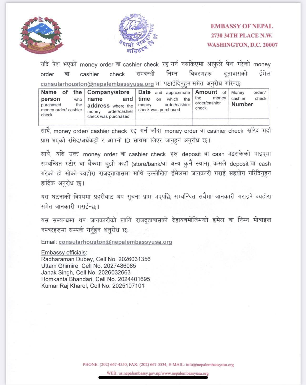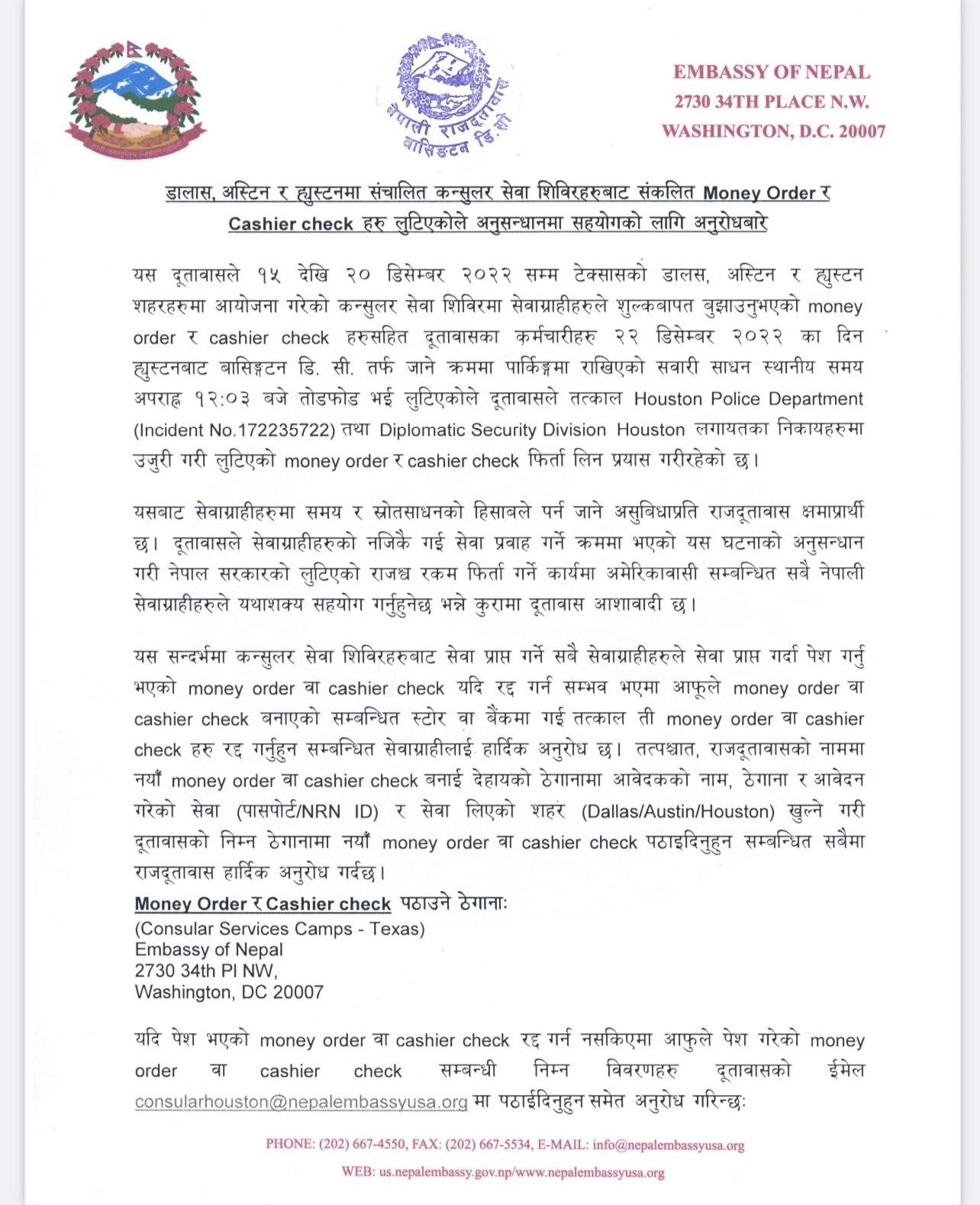 अमेरिकाको विभिन्न शहरमा राजस्व वापत उठाईएको चेक र मनि अर्डर एक हप्तापछी हराएको हो । डिसेम्बर १५ देखि २० सम्म टेक्सासको डालस, अष्टिन र ह्युस्टन शहरमा आयोजना गरेको कन्सुलर सेवा शिविरमा सेवाग्राहीहरुले शुल्कबापत बुझाएको मनी अर्डर र क्यासिएर चेक चोरी भएको हो ।