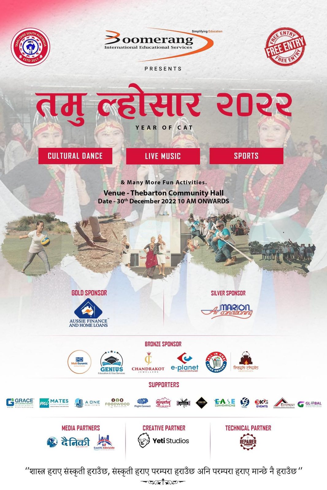 ९ पुस, एडिलेड । तमु घी साउथ अष्ट्रेलियाको आयोजनामा डिसेम्वर ३० शुक्रवार तमु ल्होसार पर्वको उपल्यक्षमा एक आयोजना हुने भएको छ । साउथ अष्ट्रेलियामा तमु ल्होसार भव्यताका साथ मनाउन तयारी गरिएको छ । एडिलेडको स्थानिय थेवाटन कम्युनिटीहलमा विहान १० बजेबाट साझ सम्म विविध कार्यक्रम हुने तमु घी साउथ अष्ट्रेलियाकी सचिव अनिता गुरुङले बताइन |
