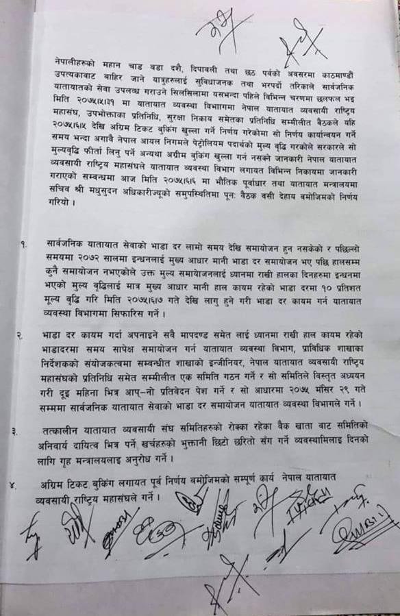 हाल कायम भाडामा १० प्रतिशत मूल्यवृद्धि गरी असाेज ७ बाट लागू गर्ने र २०७५ मंसिर २९ गतेसम्ममा वैज्ञानिक भाडादर समायाेजन गर्ने गरी यातायात व्यवसायी र सरकारबीच सहमति भएको छ ।