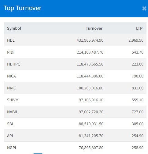 आज हिमालयन डिस्टलरीको शेयर सर्वाधिक खरिद बिक्री भएको छ । कम्पनीको सेयर ४३ करोड १९ लाख ६६ हजार रुपैयाँको कारोबार भएको छ । साथै, रिडी पावरको २१ करोड। हिमाल दोलखाको ११ करोड रुपैयाँको कारोबार भएको छ ।