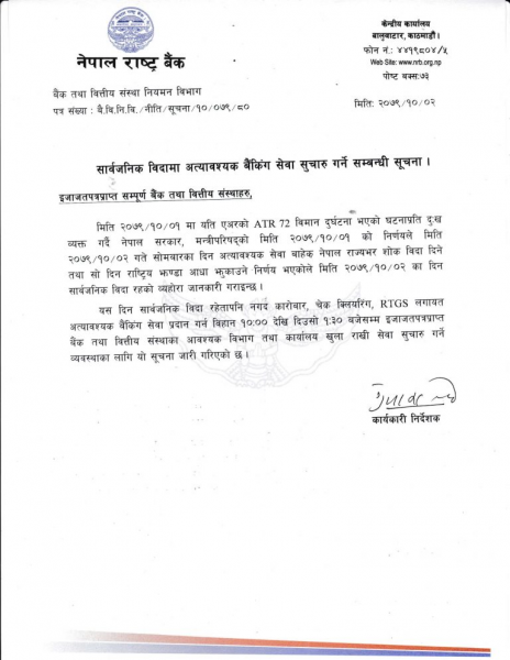 सार्वजनिक बिदा भएपनि आज साढे १ बजेसम्म बैकिङ सेवा खुला रहने