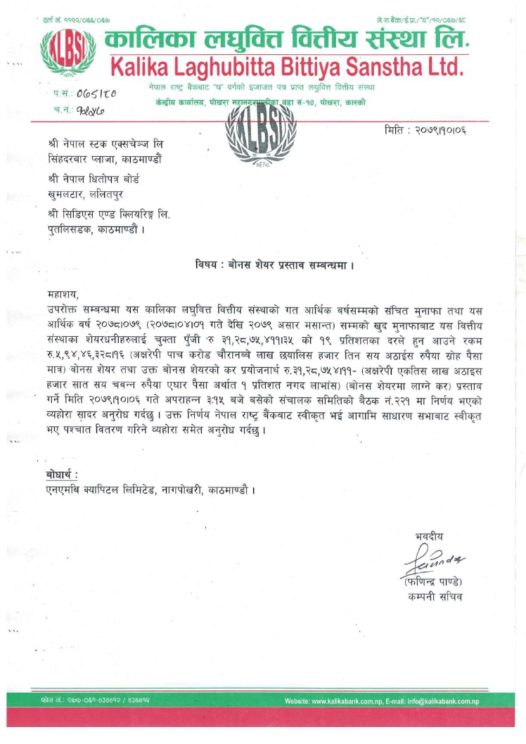 यस्तै, उक्त बोनस सेयरको कर प्रयोजनका लागि १ प्रतिशत नगद लाभांश पनि वितरण गर्ने भएको छ । प्रस्तावित बोनस सेयर नियामक नेपाल राष्ट्र बैंक र कालिकाको आगामी वार्षिक साधारणबाट पारित भएपछि सेयरधनीहरुलाई वितरण हुनेछ ।