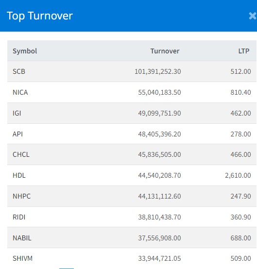 आज स्ट्याण्डर्ड चार्टर्ड बैंकको सर्वाधिक काराेबार भएकाे छ । यस दिन बैंककाे १० करोड १३ लाख रुपैयाँमाथिको कारोबार भएको छ । त्यस्तै, एनआइसी एशिया बैंकको ५ करोड ५० लाख रुपैयाँमाथि, आइएमई जनरल इन्स्योरे्रन्सको ४ करोड ९० लाख, अपि पावरको ४ करोड ८४ लाख र चिलिमे हाइड्रोपावरको ४ करोड ५८ लाख रुपैयाँमाथिको कारोबार भएको छ ।