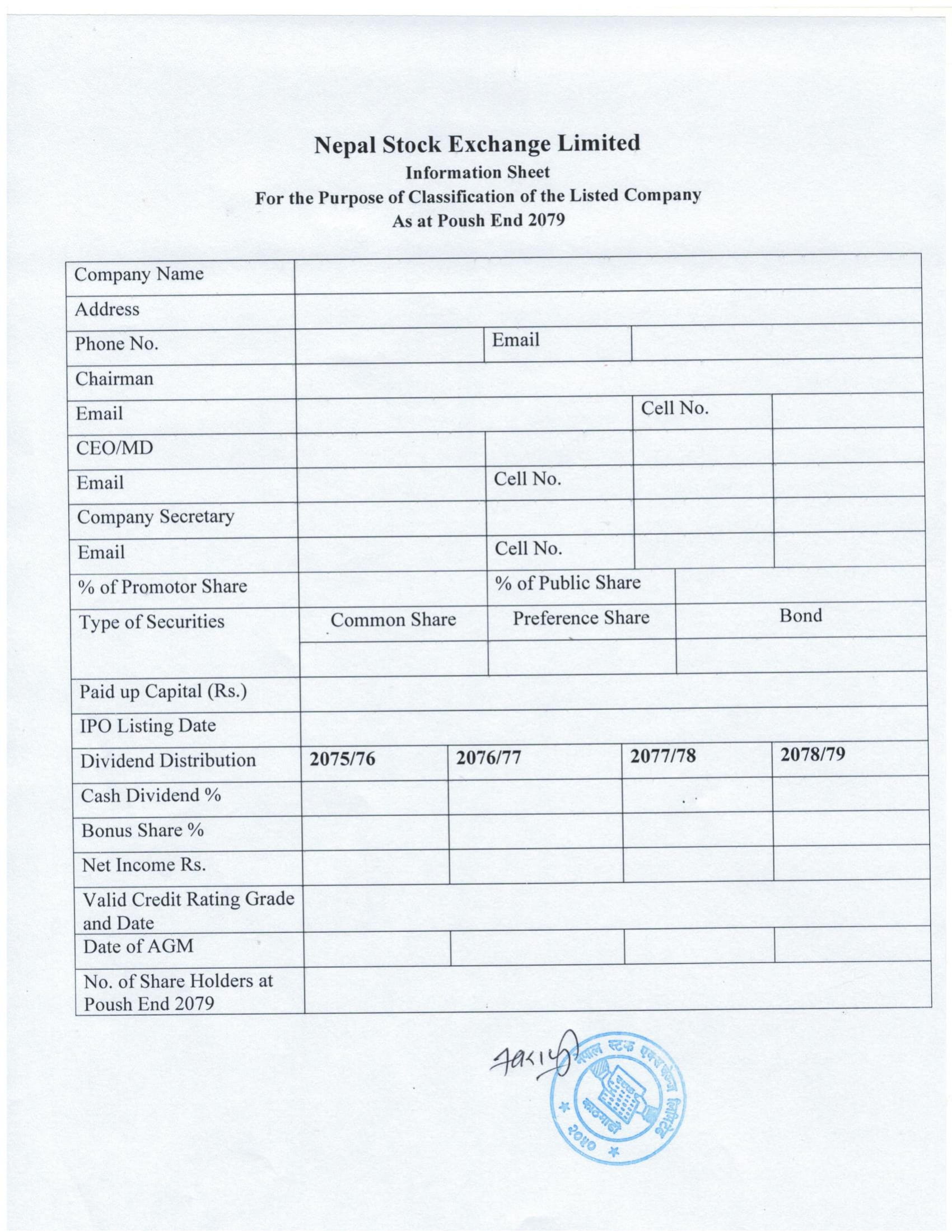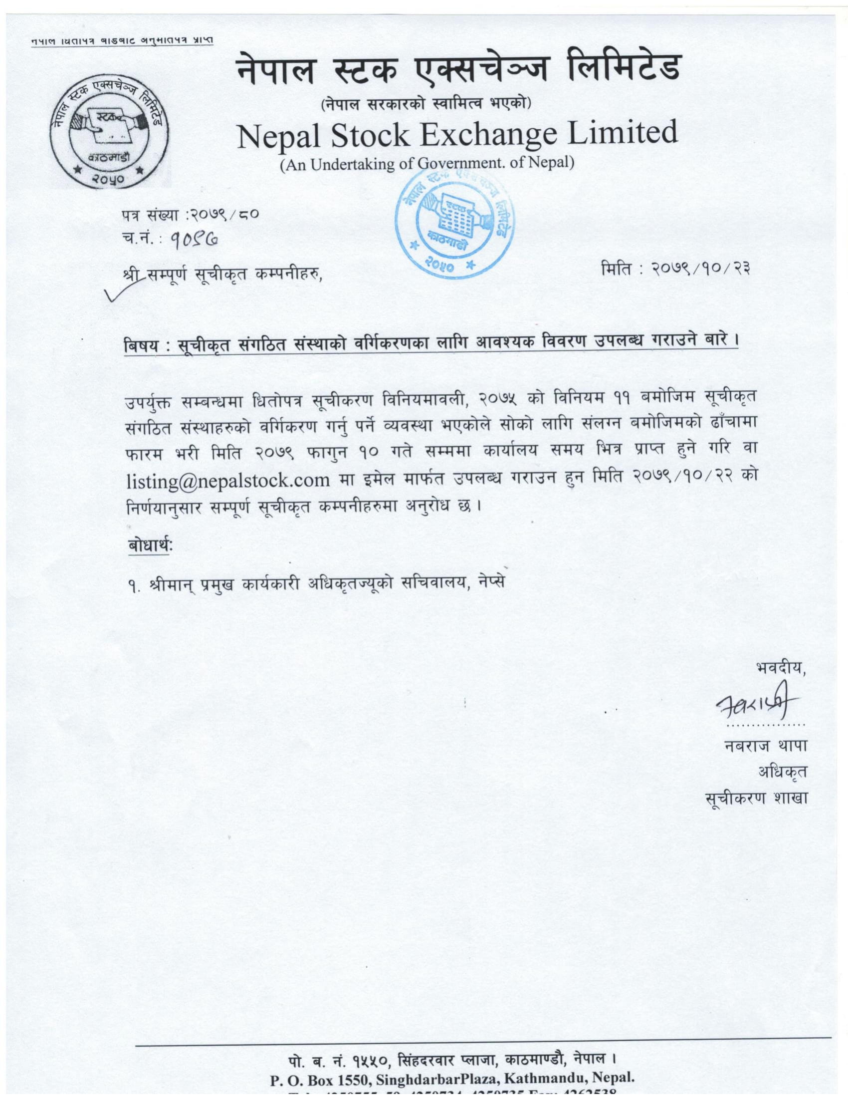 नेप्सेले धितोपत्र सूचीकरण विनियमावली, २०७५ को विनियम ११ बमोजिम सूचीकृत संगठित संस्थाहरुको वर्गिकरण गर्नुपर्ने व्यवस्था भएकोले सो का लागि संलग्न बमोजिमको ढाँचामा फारम भरी फागुन १० गतेसम्ममा कार्यालय समय भित्र प्राप्त हुने गरि वा [email protected] मा इमेल मार्फत उपलब्ध गराउन अनुराेध गरेकाे हाे ।